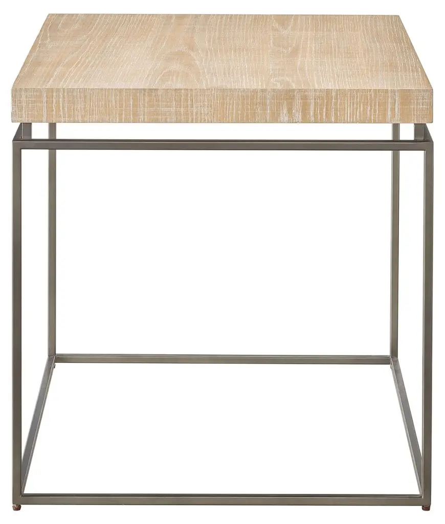 This side table's wood top seems to float above the open, minimalist metal frame. The table's combination of materials and airy silhouette make it a welcome addition to rustic and contemporary rooms alike.