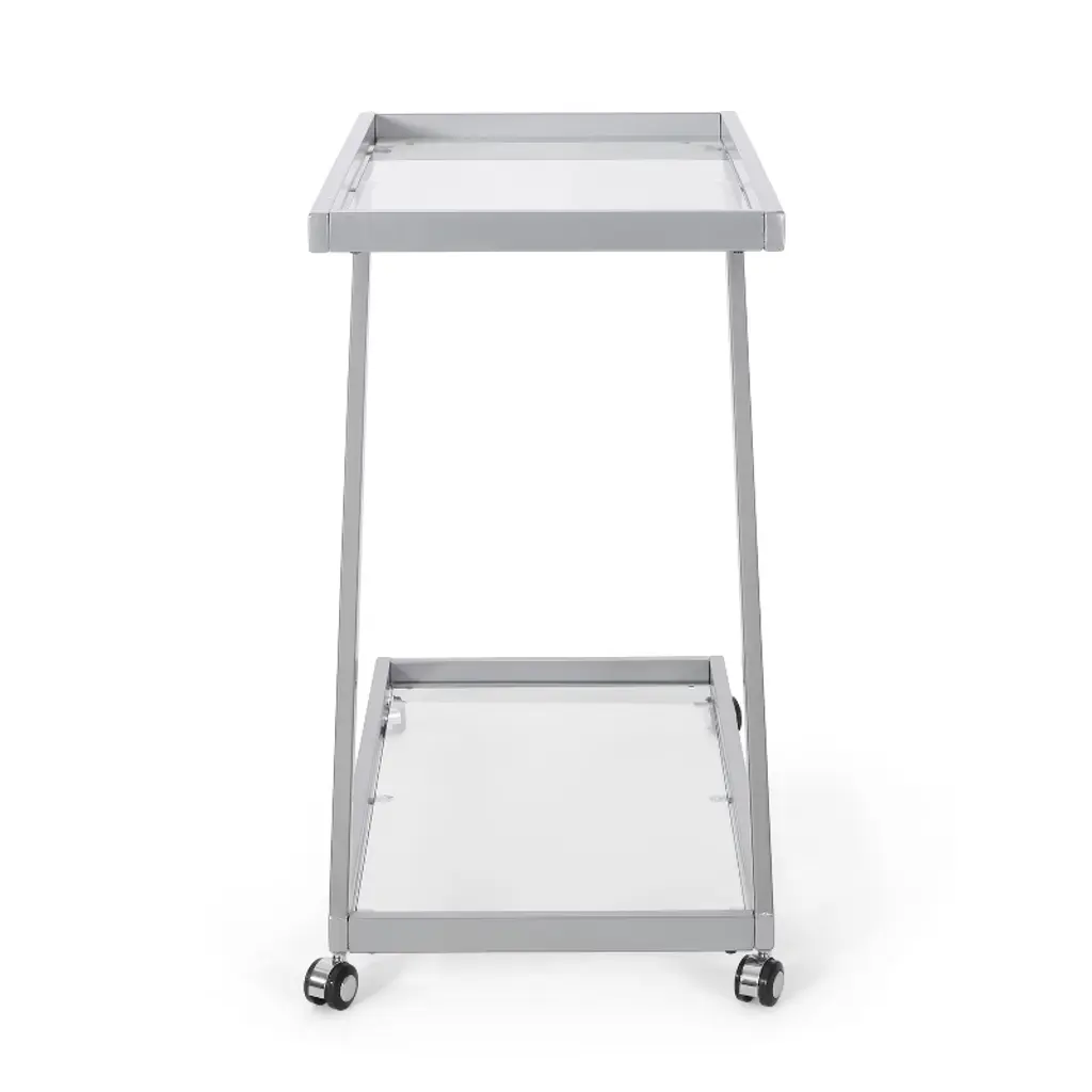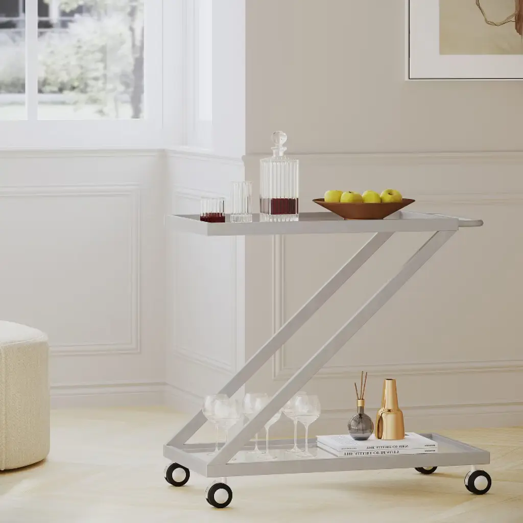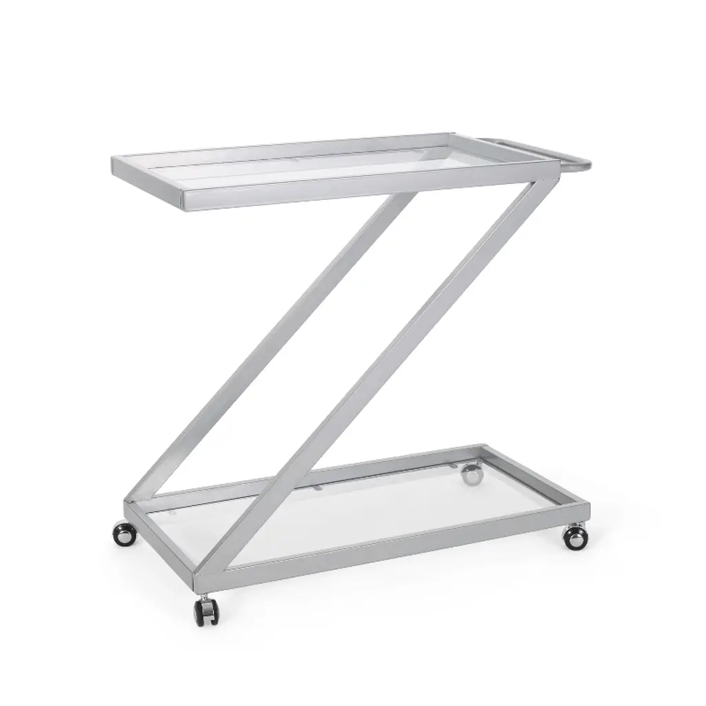 Introducing the Modern Z-Shaped Bar Cart, a sleek and functional addition to any contemporary home. Designed with clean, geometric lines and a striking Z-shaped frame, this bar cart blends minimalist style with practical storage. The two tempered glass shelves are stronger and safer than regular glass, offering durability while maintaining a light, airy look. Built with a sturdy iron base, this cart is built to last and can hold bottles, glassware, or decor with ease. Four rolling casters (two lockable) provide smooth mobility when needed and secure stability when locked in place. Whether used as a bar cart, side table, or display piece, this versatile design elevates any space.