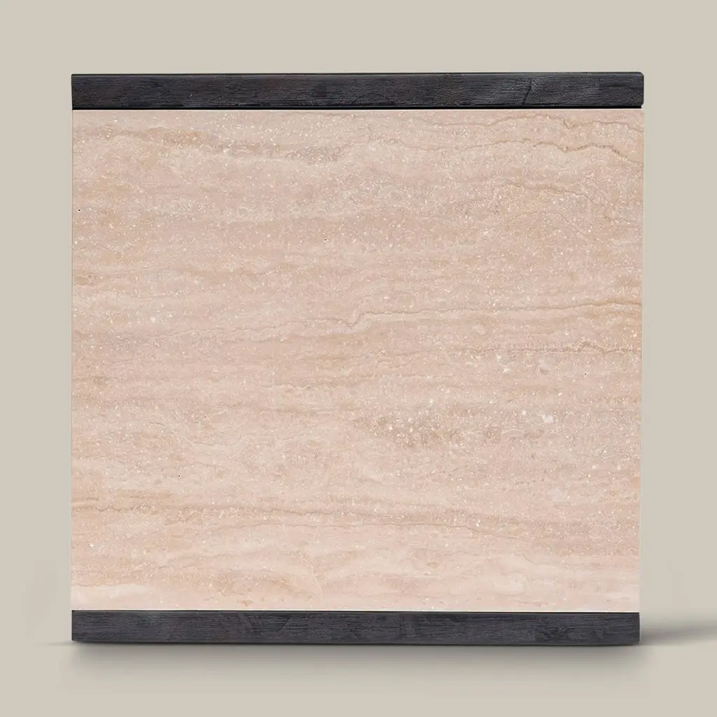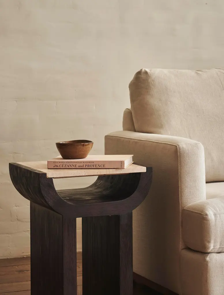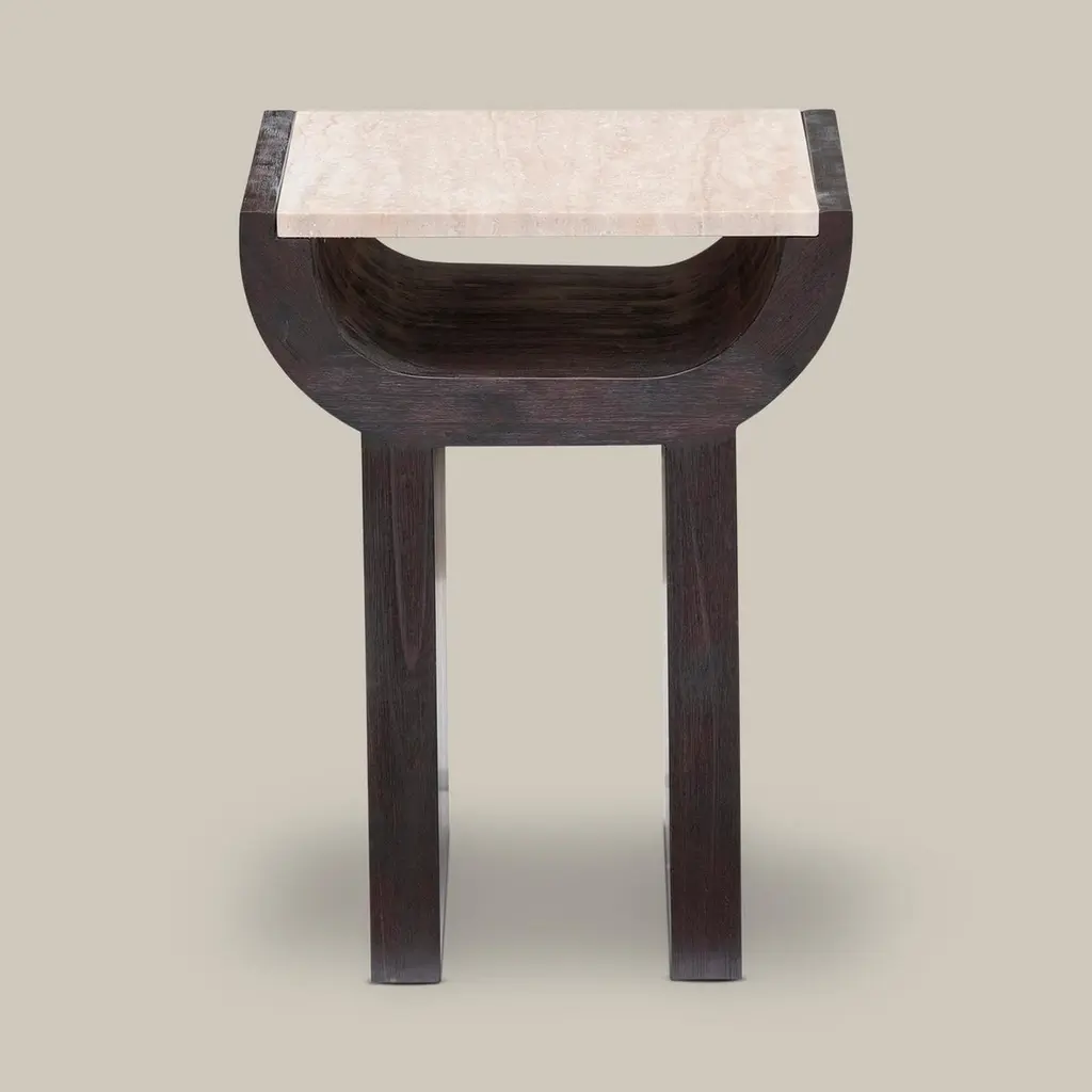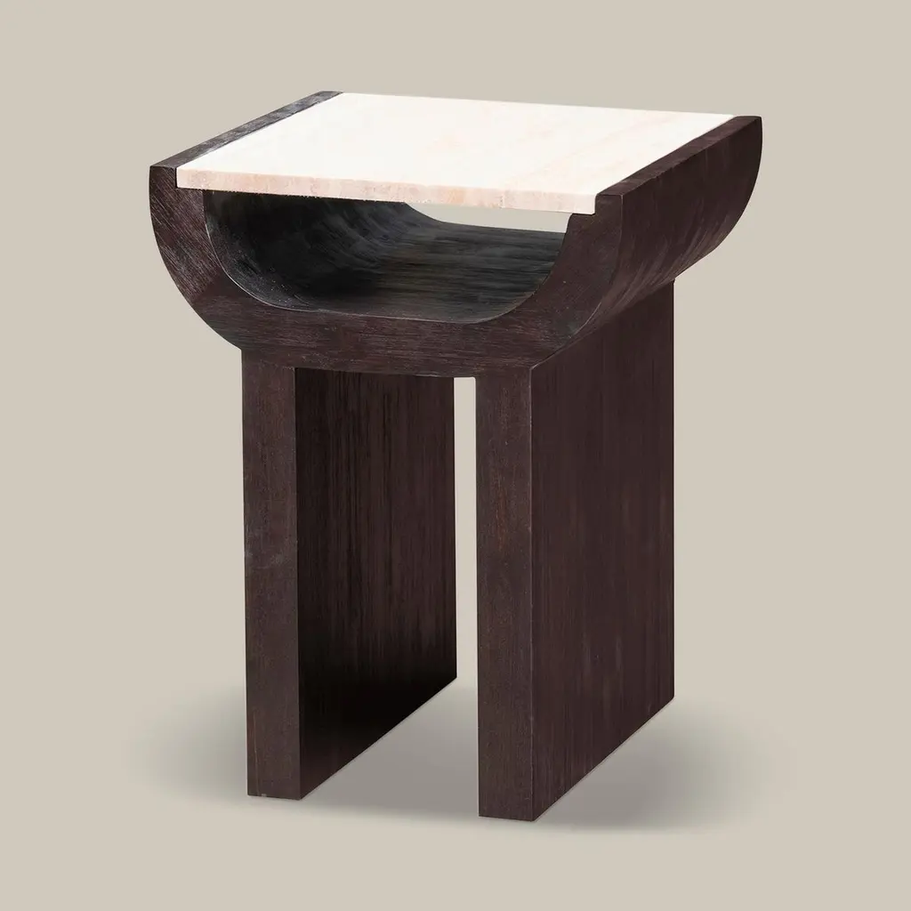 The Malus side table features dual walls that rise to an inverted arch beneath a honed natural travertine top in this artistic, sculptural side table. The inverted arch doubles as storage space for books, magazines and journals. This piece floats beautifully in any space. The mixed materials, evidence of the artist hand in the carving and the sculptural silhouette make this a statement in any environment.