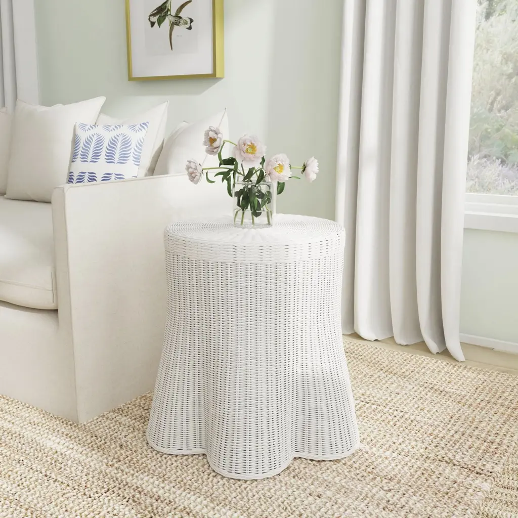 Tightly handwoven of rattan with a round top and wavy scalloped base, the Manado accent table drapes a durable hardwood frame in flowing natural texture. This skirted side table brings relaxed coastal charm and organic interest to small spaces in your choice of monochromatic colors. An on-trend platform for decor, plants or serving cocktails, its flared base adds decorative curves to modern and contemporary rooms.