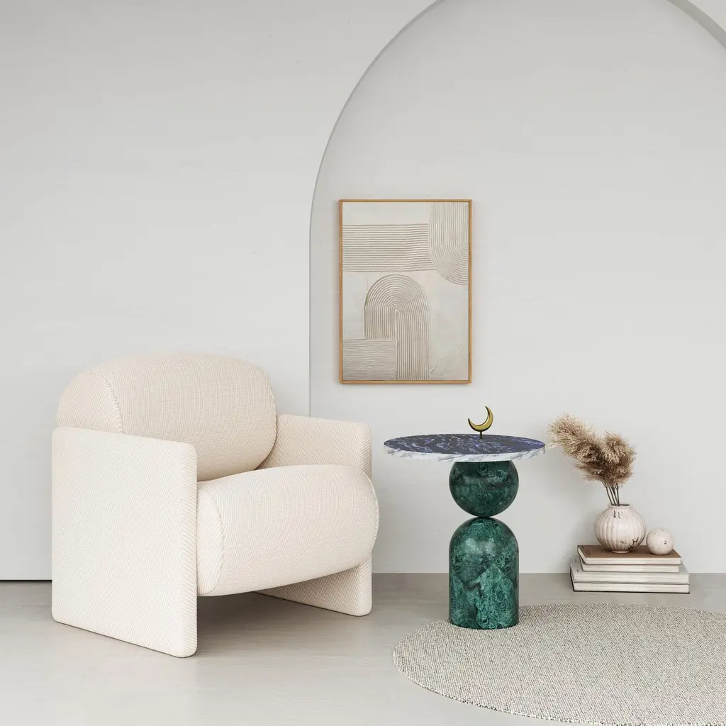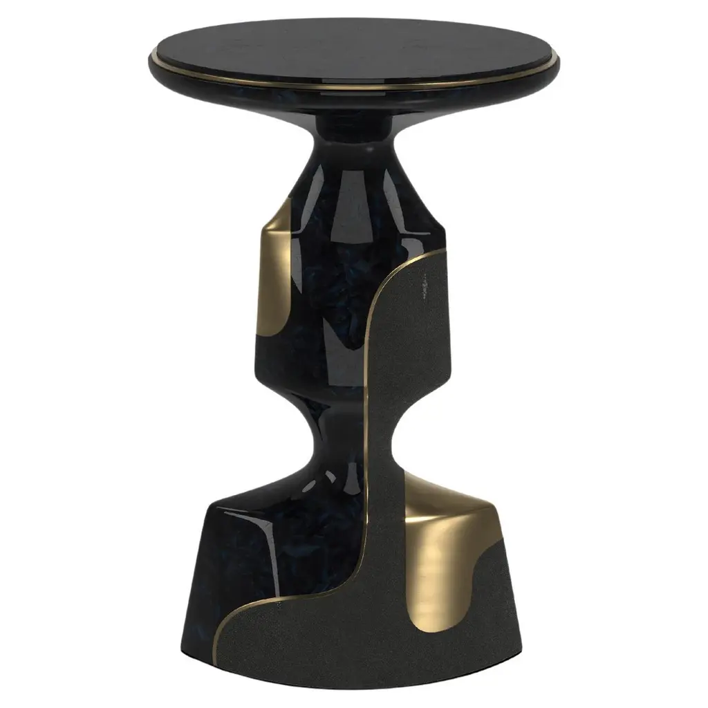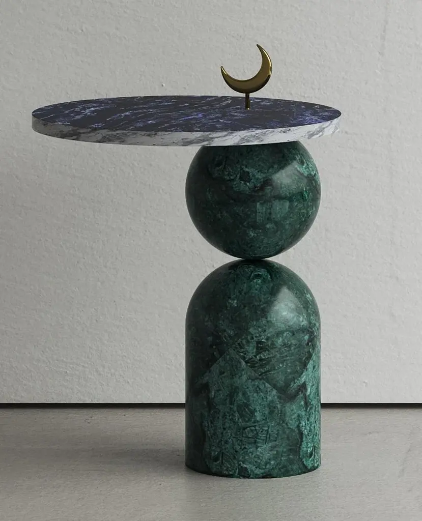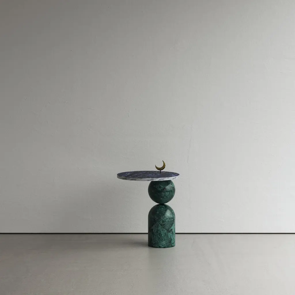 Mandacaru side table by Gabriela CamposDimensions: Ø 45 x H 50 cm.Materials: Marble composition on emerald green, blue martinica and rafaello, Brass Sculpture.The work “A Lua” (1928) by Tarsila do Amaral, purchased by MoMA in New York in 2019, established the Brazilian artist in the scene of the most relevant and eternalized international modern painters. The landscape that stretches against a waning moonlit night is delicately embodied in a small brass sculpture on our side table. Its base structure alludes to the solitary cactus. The top with the edge detail repeats the rounded shapes of the landscape, and the use of colors follows the essence of the work, with its organic and fluid design.