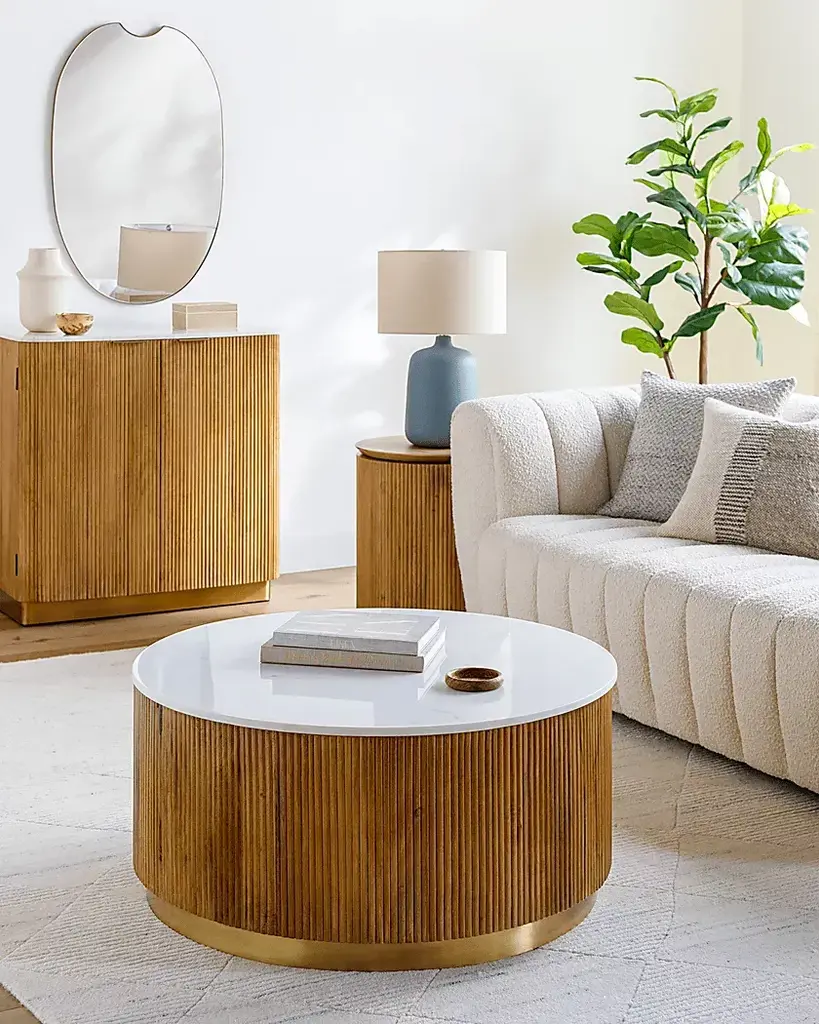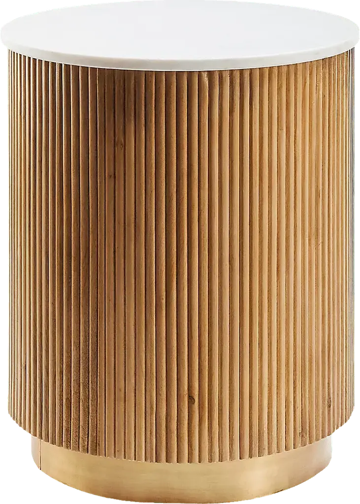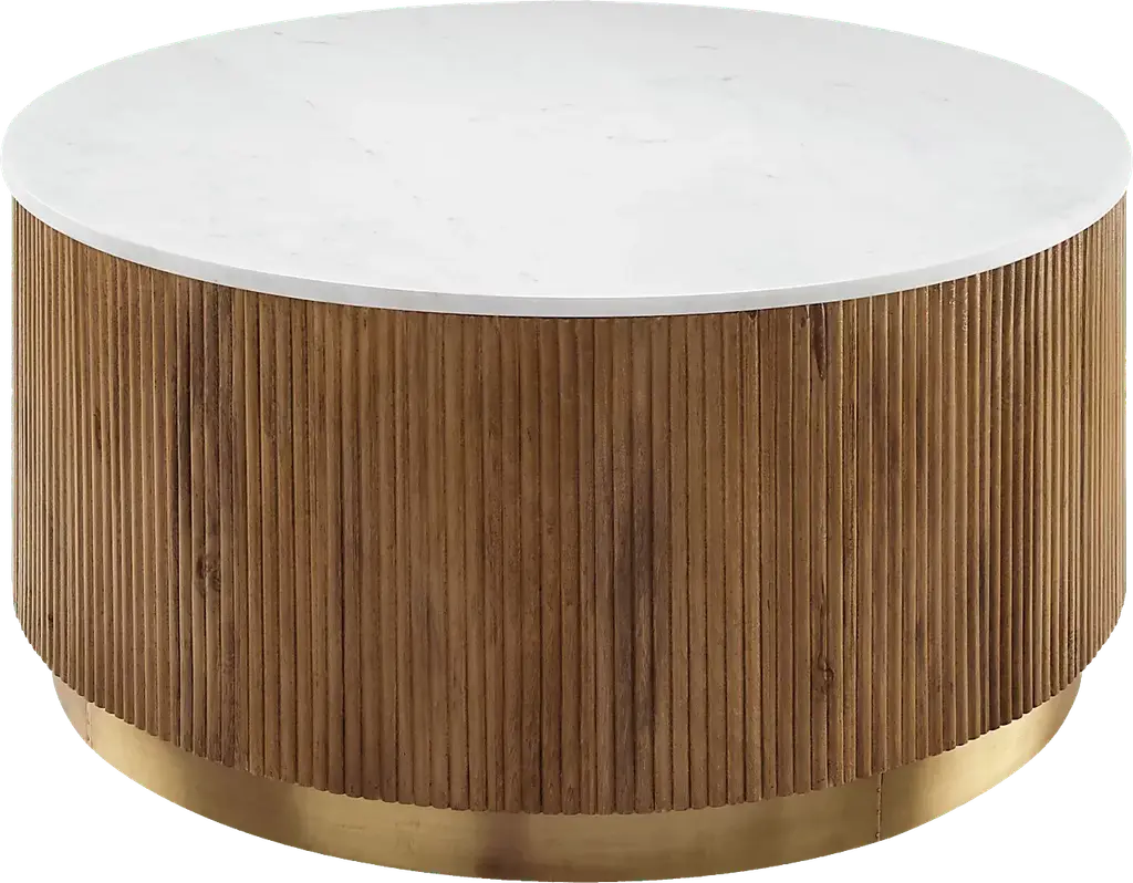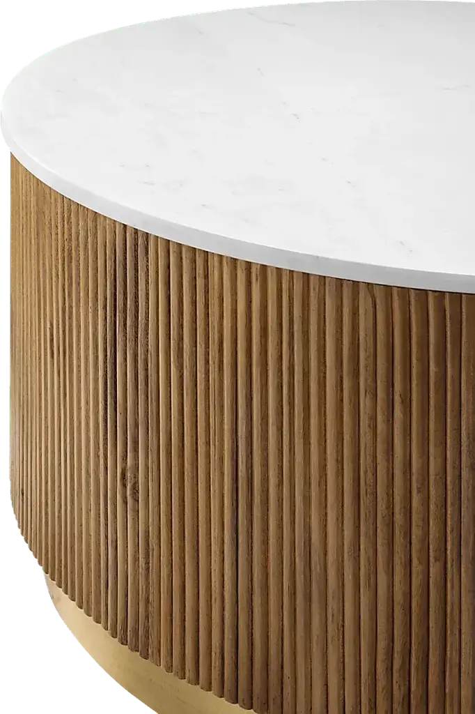 Breezy sophistication comes to life in the elegant curves of the Mango Bay collection, putting the ease of a faraway escape within reach. This modern table set features a cocktail table and two end tables with marble tops in white, showcasing gorgeous natural patterns throughout. A reeded plinth base in a brown finish on each creates a bold silhouette, finished with a brass band for an added touch of brilliance.