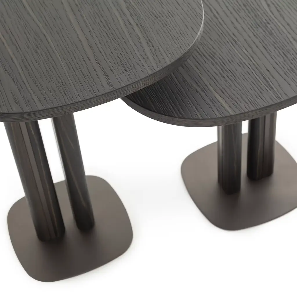 Manhattan situated between two rivers inspired the dynamic design of this side table, where a burnished metal base varnished with epoxy powders is flanked by solid oak inserts. Its shaped MDF top (19 mm thick) is veneered with Laguna oak that stays perfectly coherent with the piece's general chromatic depth. Different versions and sizes are available in the Concierge.