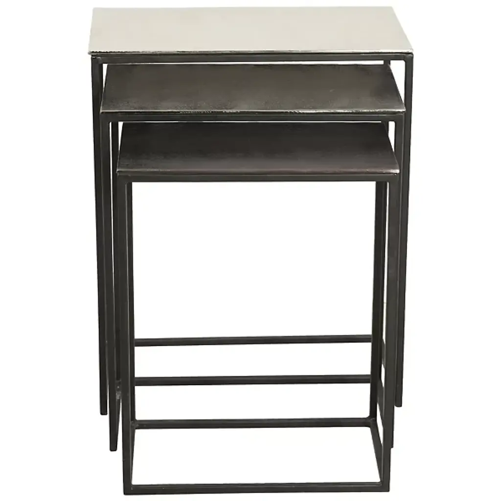 The Manisa Accent Table, Set of 3 from Renwil extends a charming modern practicality to spaces. This robust series of aluminum and iron constructions stack atop each other, the smallest table with the darkest top forming a full rectangular prism construction, while the two successively larger tables have bracket-style bases, allowing each smaller table to slide under it for storage. Each table’s top lightens in color the broader it gets, creating an artistic gradient when placed in proximity.