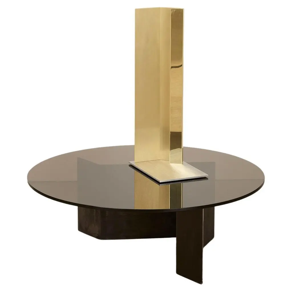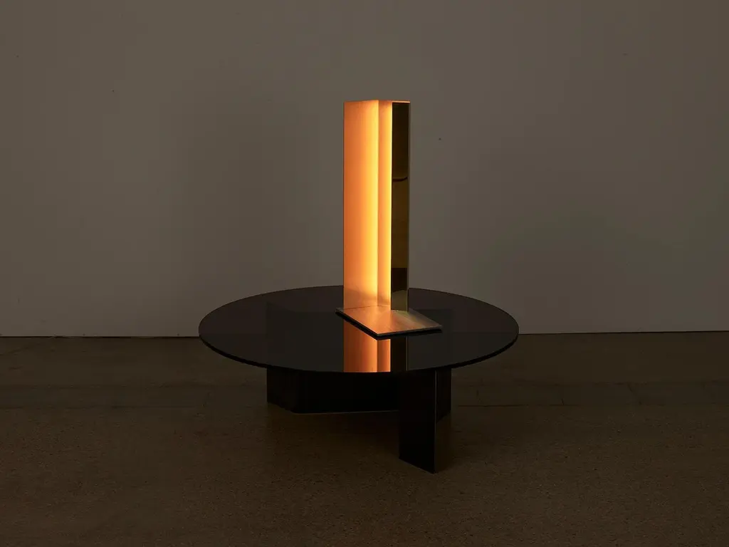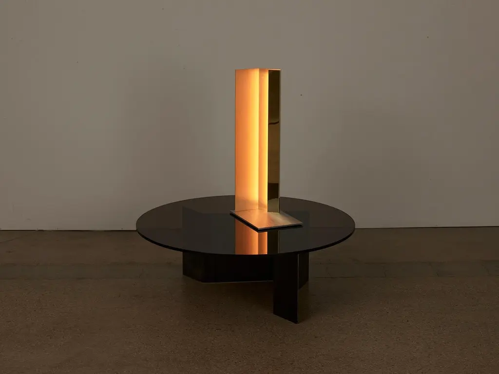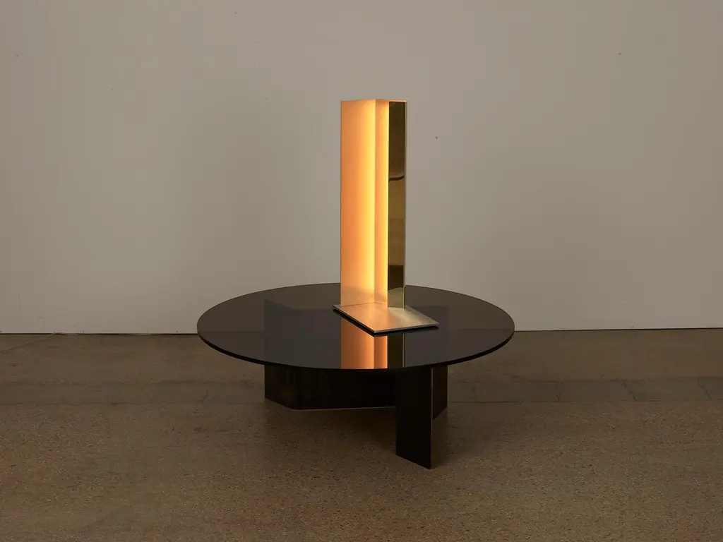 Mano standing lamp table by Umberto Bellardi RicciDimensions: W15.2 x D27.9 x H31.7 cmMaterials: brasse, aluminium base, led strip.All our lamps can be wired according to each country. If sold to the USA it will be wired for the USA for instance.Umberto Bellardi Ricci is an Italian sculptor and architect based in New York City, practicing across London, Mexico, and New York. His work revolves around the interplay of art and design while exploring the spatial aspects of sculpture and social sciences through the medium of architecture. Umberto initially started with geometric abstraction largely interpreted in cast concrete, influenced by his Japanese mentor and Mexican modernism, as he founded an acclaimed sculptural project in Las Pozas, the surrealist garden in central Mexico. Since he relocated to New York, he has been focusing on a series of folded steel and brass sculptures, that often incorporate reflective light sources. While he still works with abstract compositions, pairing ready-made materials with crafted wood and rubber details, his latest furniture pieces explore the dialogue between contrasting raw construction elements, such as I-beams or concrete blocks, and refined textures like marble and glass. Having taught architecture for many years at the Architectural Association in London and at the Cornell University in New York, he designed the home for Turner Price laureate Laure Prouvost in Hackney, and has recently been commissioned to make objects and furniture for Jenna Lyons’ studio in Soho.