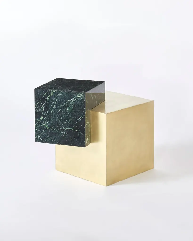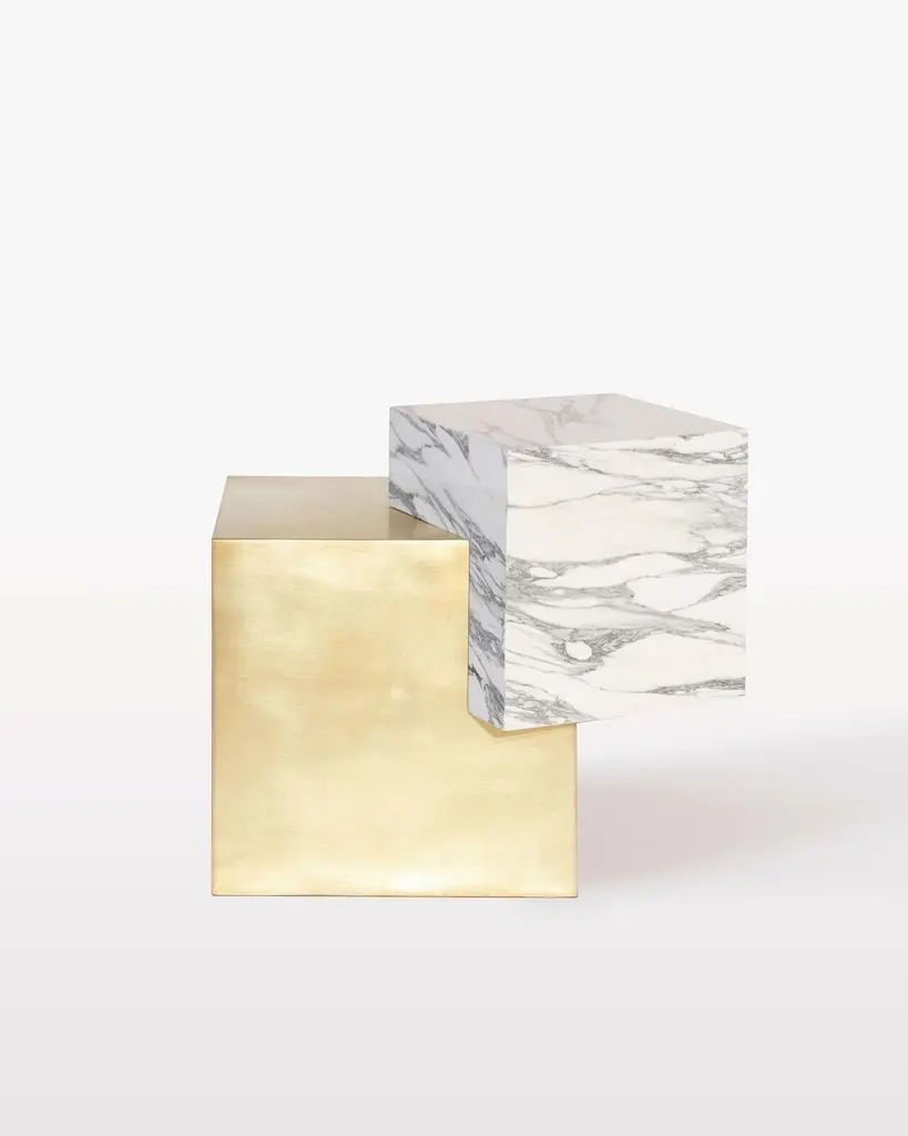 The coexist askew side table is an exploration of balance, material, and harmony. The materials consist of a brushed brass cube base and a marble cube top.The table features a marble cube balanced at an unexpected angle on the brass cube base. The two cubes are interacting in an off-kilter way and the dependence of each material on the other allows the piece to exist. There is no hardware used to hold the piece together, rather precision fitting and engineering allows for the parts to rely upon one another to exist. The accent furniture piece can serve as a side table or coffee table.This piece is designed and manufactured locally in New York City.This piece can be customized concerning size, materials, and finishes.
