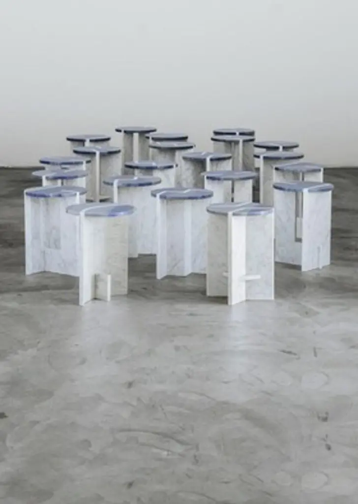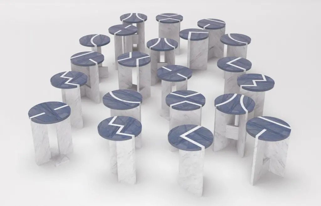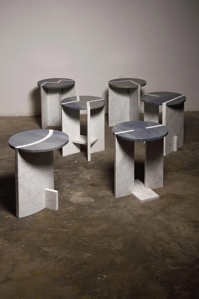 Marble "Athos" table - Giorgio Bonaguro.Dimensions: 320 W x 430 H x 340 D.Materials: carrara marble, brazilian granite.Top is also available in Azul Macaubas and the table can be curved.Tribute to Athos Bulcao, Brazilian painter and sculptor who collaborated with Oscar Niemeyer and colored his Brasilia with the "azulejos" - glazed and decorated ceramic architectural ornaments - the Athos collection is a three-dimensional interpretation of the work of Bulcao, in which the designer Giorgio Bonaguro combines the white carrara marble, typical Italian stone, to the azul macaubas, a brazilian granite, creating a physical and ideal bridge between the two countries. The graphic sign of the azulejos is thus transformed into matter, into a pillar that is both base and decoration and which plays with contrasts, stylized forms and calligraphy, where calòs - the beauty meet graphia - the writing. Athos tables are part of the collection “Marble Stories”, a project by Giorgio Bonaguro, Gustavo Martini and Ronald Sasson, in collaboration with Marimar srl. These Italian-Brazilian designers decided to develop a common exhibition project in which their styles interact to tell different stories around a single precious material: marble.Giorgio Bonaguro studied mechanical engineering in Modena and then graduated at Scuola Politecnica di Design in Milan, in the double Master of Industrial and Interior Design. He has worked in several design studios in Milan, first at Lorenzo Palmeri's, then with Francesco Faccin, at Michele De Lucchi's Studio. And then with the designer and critic Marco Romanelli. He collaborates with several companies and develops limited editions presented at some international fairs such as Salone del Mobile, Design Miami, London Design Festival, Maison et Objet, Design Days Dubay, ecc. He works between Italy and Brazil in the field of product design, interior design, exhibition and lighting, trying to combine a linear style with research and contamination between materials.