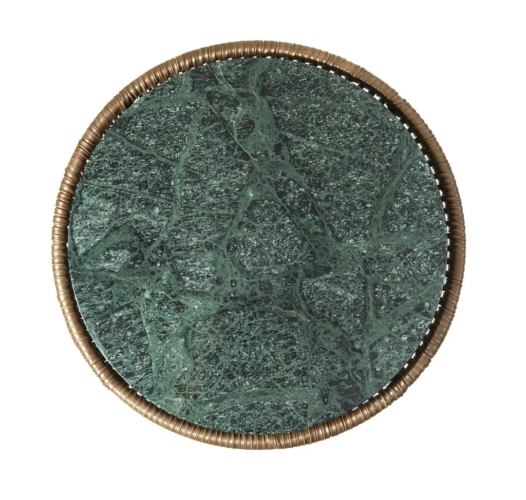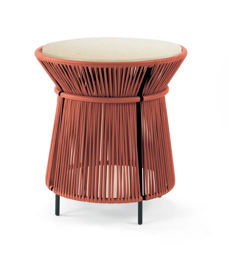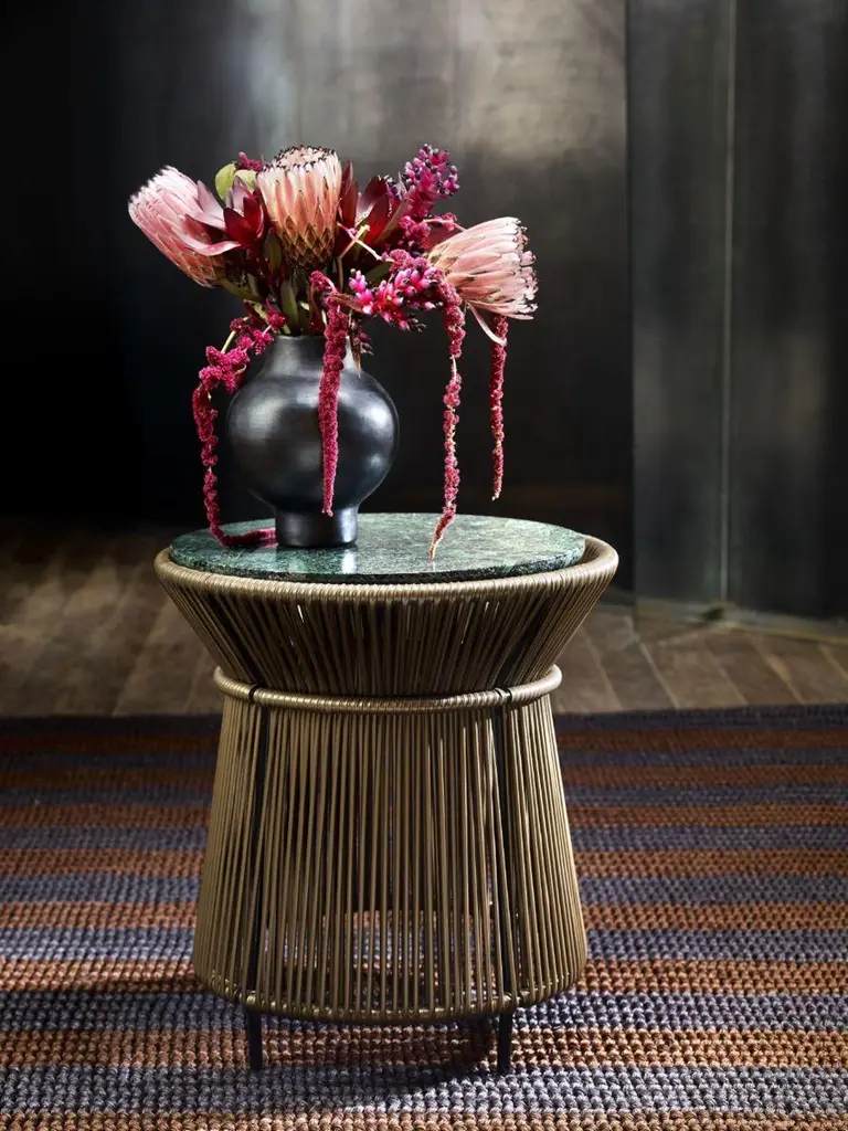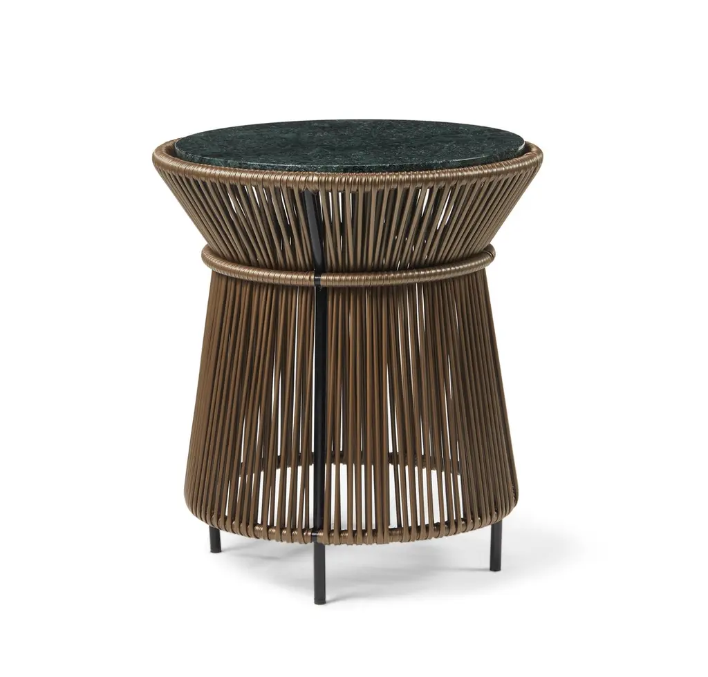 Marble top caribe chic high table by Sebastian HerknerMaterials: Galvanized and powder-coated tubular steel. PVC strings are made from recycled plastic. Marble.Technique: Made from recycled plastic and weaved by local craftspeople in Colombia. Dimensions: Diameter 46.1 x height 50 cm Available in colors: nero marquinia unito/ cobre/ black, verde guatemala/ terra/ black, crema nuova/ cobre/ black. The Caribe chic tall side table is an elegant design by Sebastian Herkner and can be used inside and outdoors. It’s part of our Caribe Chic collection, featuring an intricate hand-woven webbing in earthy, muted shades. The tabletop comes in three different types of fine Italian marble. The pieces and colors are inspired by the incredible nature of the Colombian Huila region where the serene Tatacoa desert meets the powerful Rio Magdalena.Each table is made in Santa Marta, a city on the Caribbean coast of Colombia, by local craftspeople. They weave the PVC strings, which are made from recycled plastic, around a powder-coated tubular steel frame. The weaving technique the artesanos and artesanas use are called Momposino, a traditional method known for intricate patterns. Just the preparation of all the materials takes ten days, while the production of each bench takes two days.German designer Sebastian Herkner is a long-term collaborator of Ames and has visited Colombia multiple times to experience the country’s cities, nature and people first hand. He also visited many of the ateliers that Ames has partnered with to learn about the unique traditional crafts of Colombia's regions. A sought-after contemporary designer and recipient of many industry awards, he has worked with many international design brands, creating intriguing pieces that showcase his intuition for interesting material, color, and texture combinations.