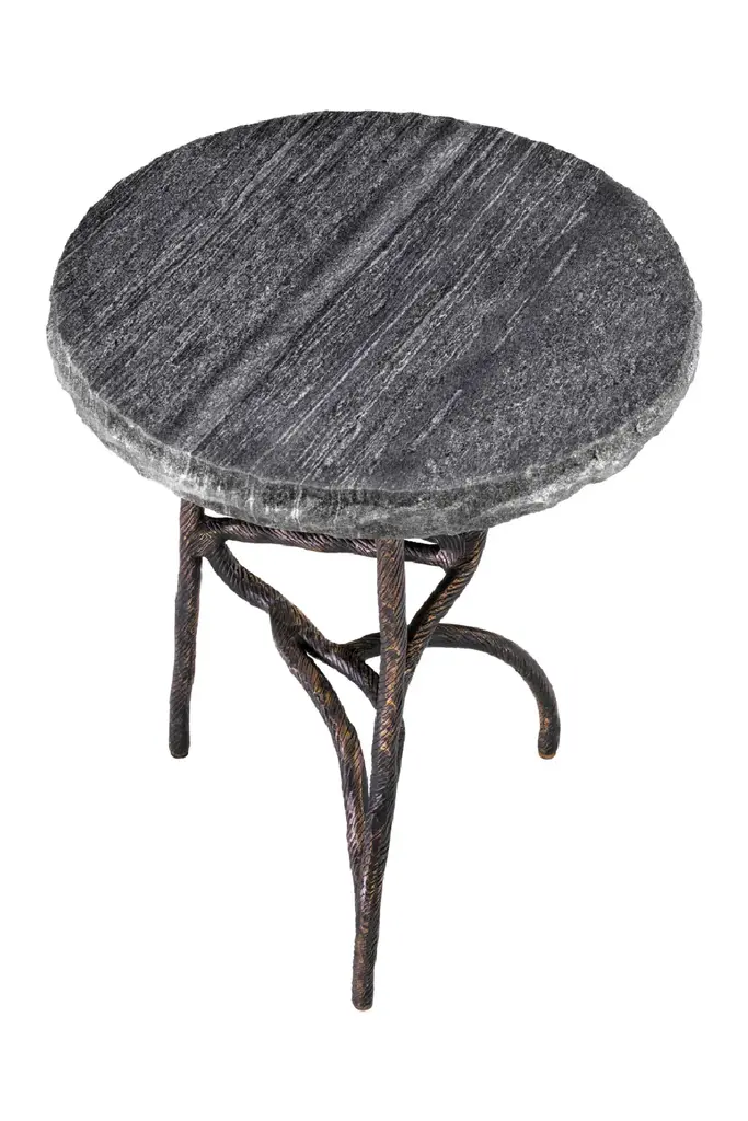The Dreyfus Side Table by Eichholtz is a captivating piece that seamlessly blends nature-inspired aesthetics with timeless elegance. It features a round gray marble top, showcasing the exquisite beauty of natural stone. Its vintage brass finished legs are designed to resemble organic, thin branches. Experience the nature's artistry and modern aesthetic with this remarkable side table.