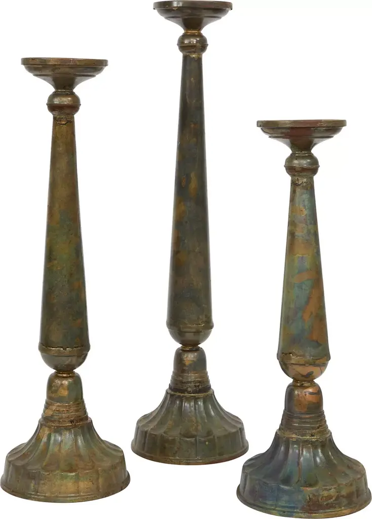 Crafted with iron in a distressed shade of green, our Marcelene candleholders are an elegant blend of vintage and industrial appeal. As the finishing touch on top of your dresser or a flourish of light on your side table, 19, 22 and 25-inch sizes can be styled alone or in a charming trio. Please select your size before adding to cart.