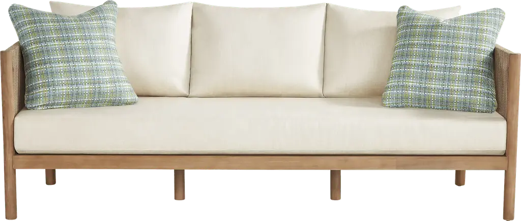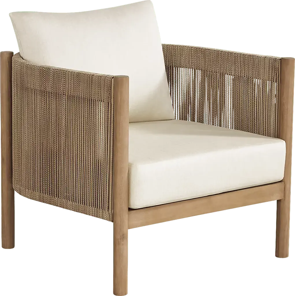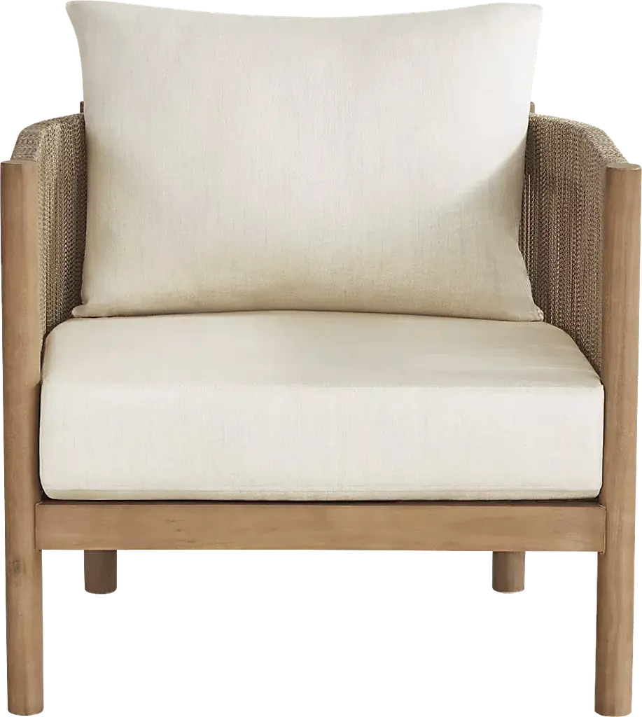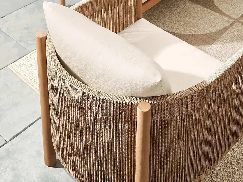 As relaxing as a sunset toast in Tahiti and as tempting as an ocean view in the Bahamas, the Marche seating set brings a world-class resort lifestyle outside to your patio. All-weather rope in colorfast beige coils around frames of rust resistant aluminum, running parallel to solid eucalyptus legs in a natural finish. Outdoor cushions in beige offer the perfect touch of durable softness for relaxation. The included end tables complete the natural harmony with eucalyptus legs and sintered stone tops. Set does not include nesting cocktail tables.