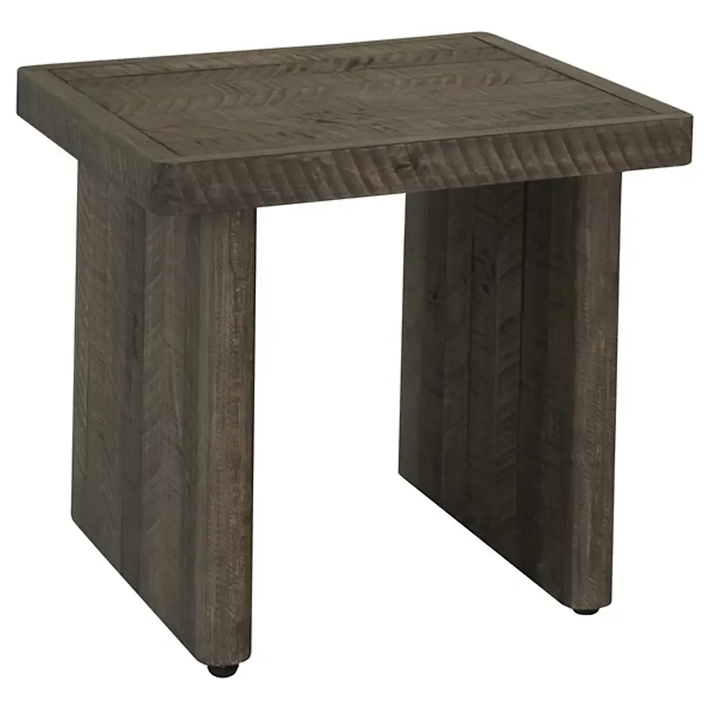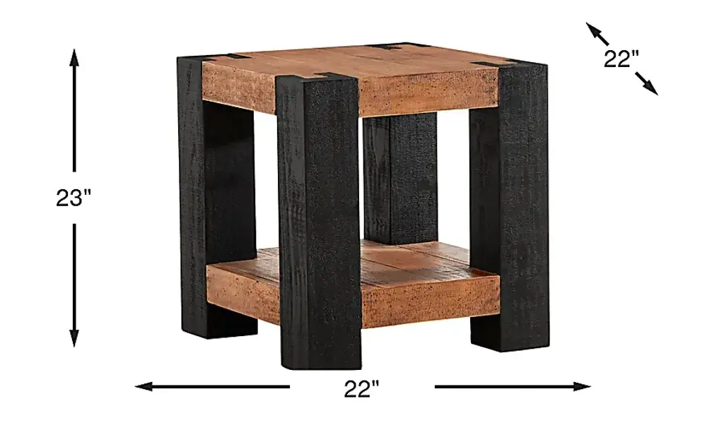 Light catches the tabletop's grain and warm tones settle into the room as the Marco table collection's inviting texture and structural form come to life. Rooted in modern style, this end table adds a cozy and organic charm to any room. The plank-inspired top crafted from pine veneers in a rich, natural brown finish boasts intricate wood-like detailing, bringing a touch of nature indoors. Square black legs peek through each corner, highlighting the table's clean-lined silhouette and bold contrast.
