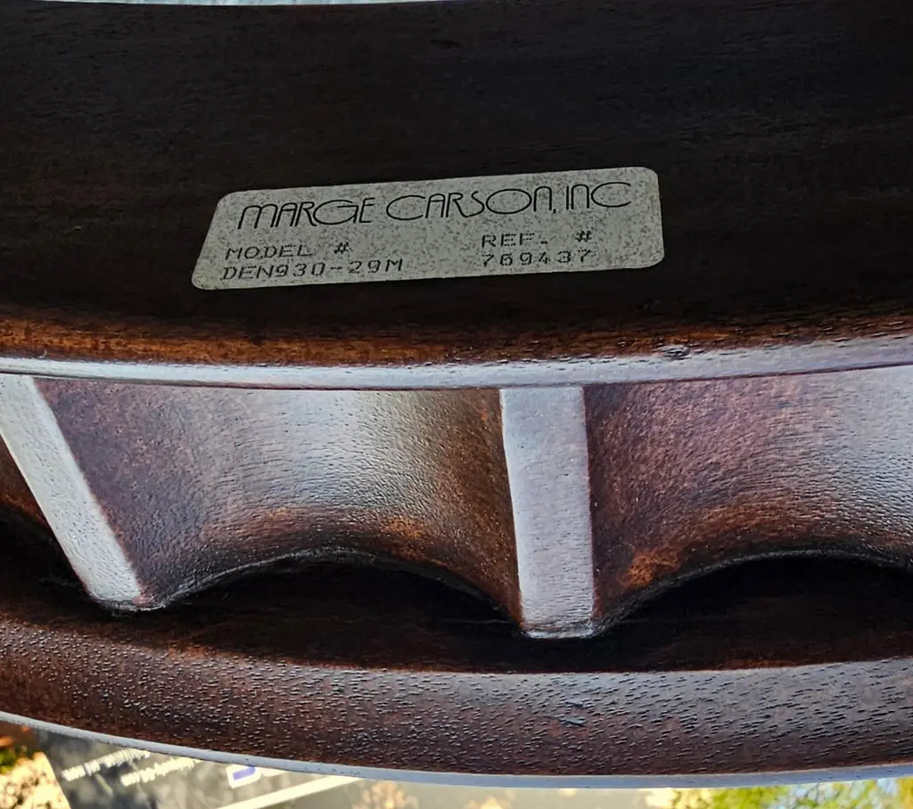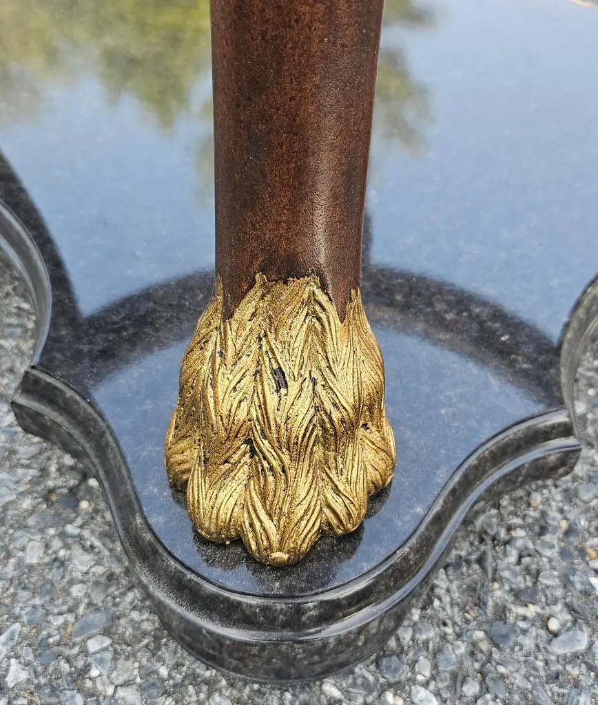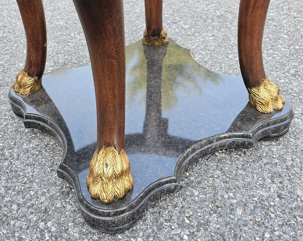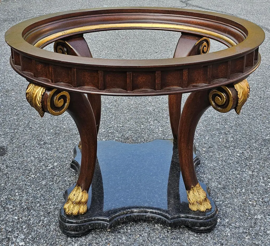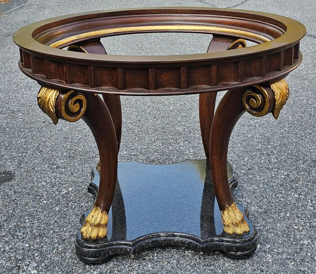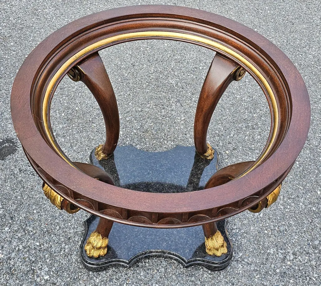 A Marge Carson Neoclassical Style Fruitwood and Partial Gilt Glass Top Center Table or large Side table. Measures 39" in diameter and 29" in height. Ogee edge tempered glass top.