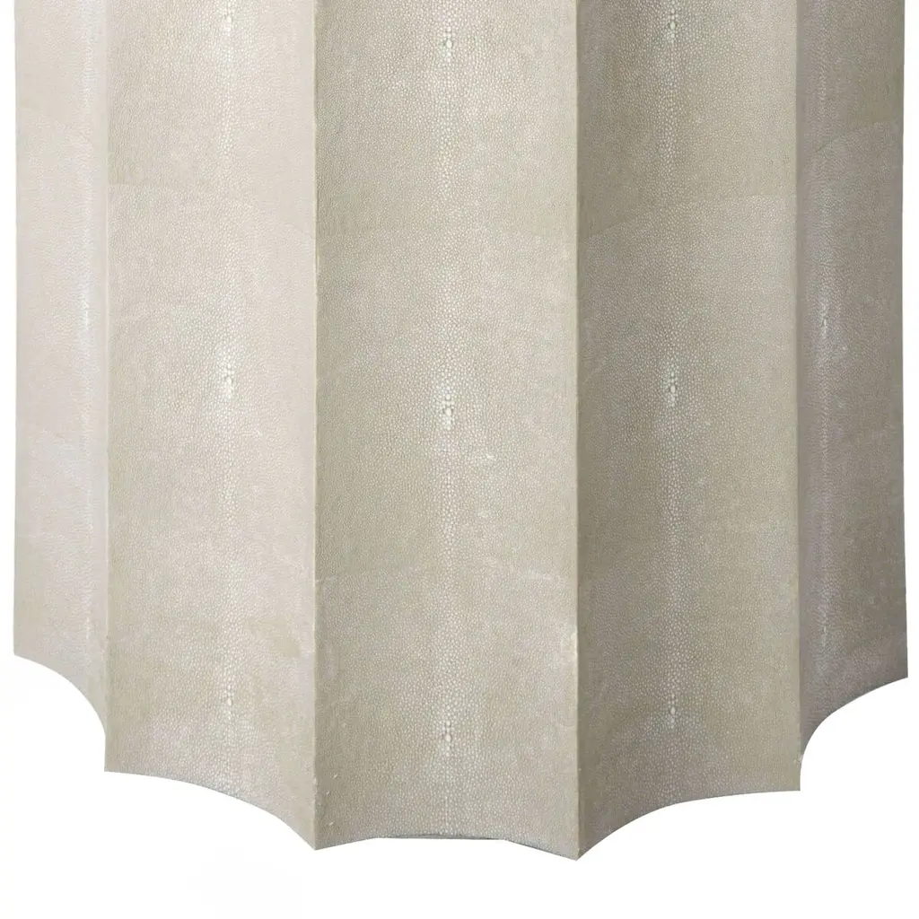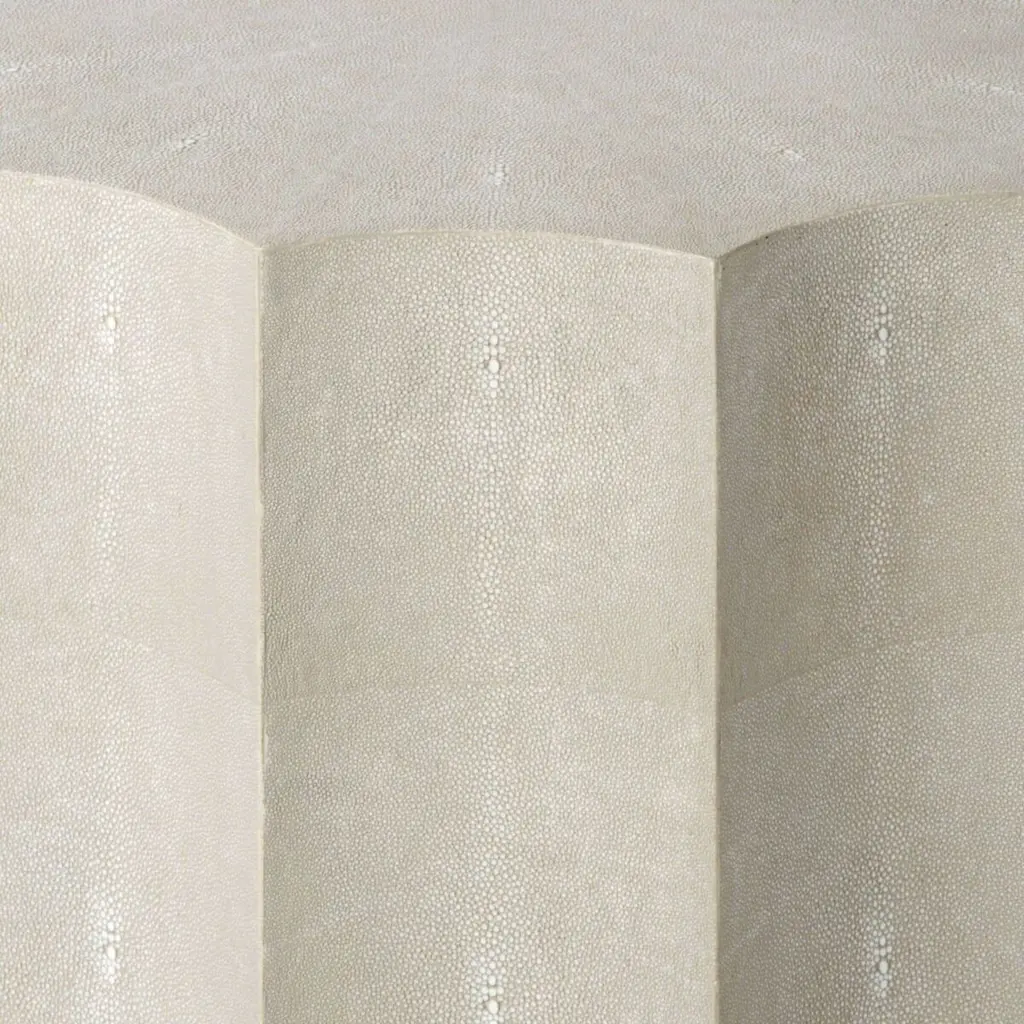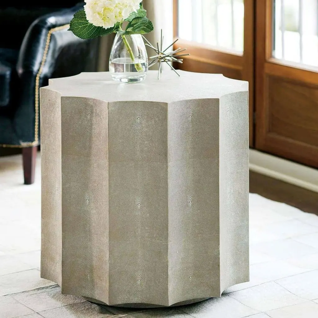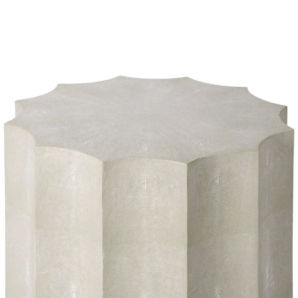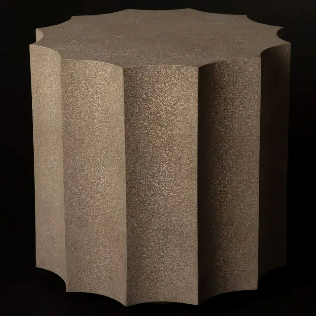 The scalloped silhouette and textural faux shagreen finish brings a contemporary elegance to this side table, which can easily double as a stool.
