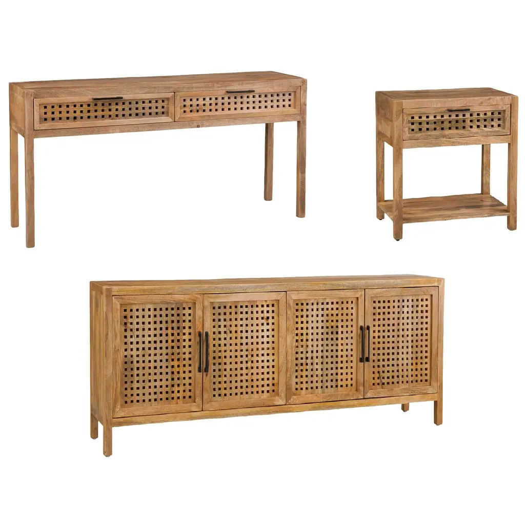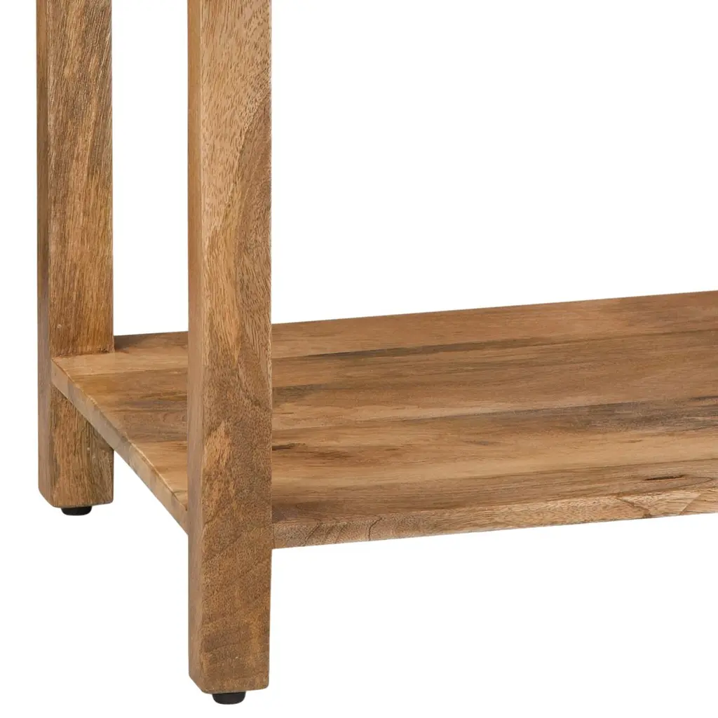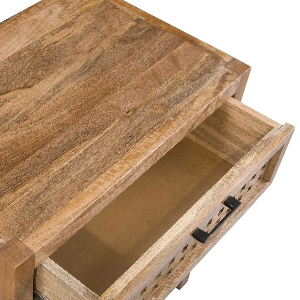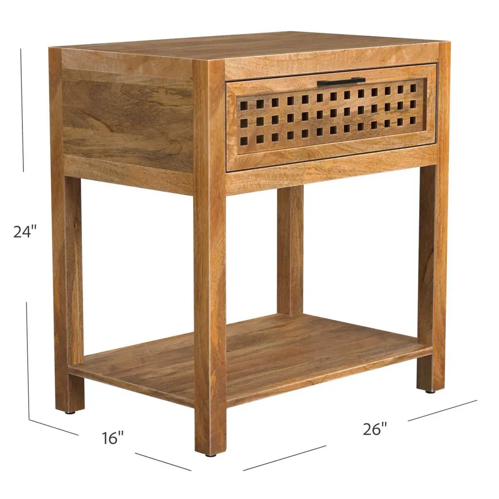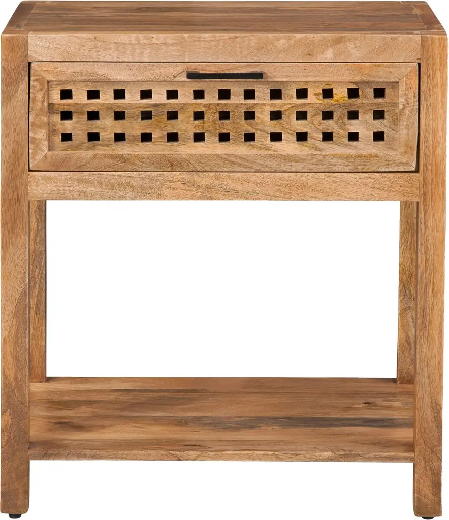In addition to being one of the more eco-friendly hardwoods, mango has a warm, rich grain. That's beautifully apparent on this side table. The pierced fretwork of the drawer front adds global allure; the bottom shelf provides additional storage or display space.