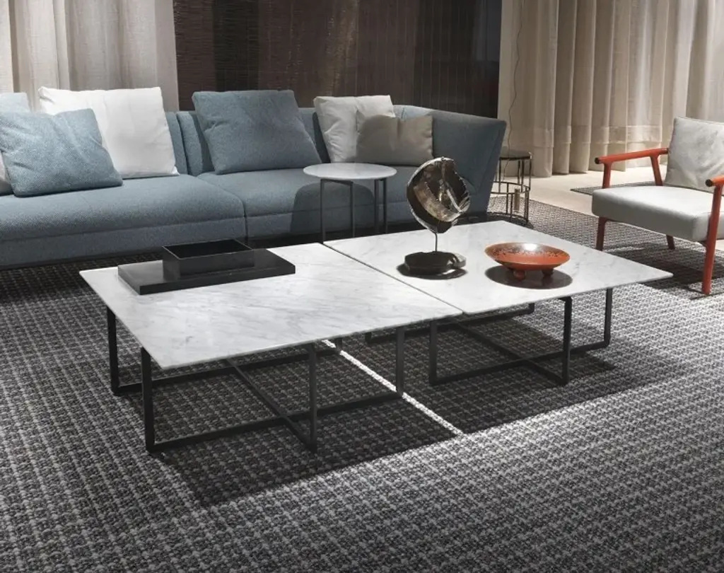 A collection of graceful, refined round, square and rectangular tables. The structure is in metal, with an original graphic touch on the leg. The tables are completed by marble tops in Pinta Verde – a white crystalline marble with gentle green shadings – and Verde Alpi, with a dark background and green veins. The family also includes a small desk with drawers on the same metal base as the tables, with an elegant top clad in cowhide. A gem of an object that can resolve the needs of a home-office in an apartment, or add an elegant touch to the rooms in a boutique hotel.TECHNICAL SPECIFICATIONSFRAME IN SATINED, CHROMED, BLACK CHROMED, BURNISHED, BRONZED 457 OR CHAMPAGNE METAL.TOP IN MARBLE GLOSSY WHITE CARRARA, GLOSSY BLACK MARQUINIA, EMPERADOR EITHER GLOSSY OR MATT, EMPERADOR LIGHT, CALACATTA ORO EITHER GLOSSY OR MATT, ROSSO LEPANTO, VERDE ALPI, PINTA VERDE. MATERIAL1. FRAMEMETAL FINISHES2. TOPMARBLE FINISHES