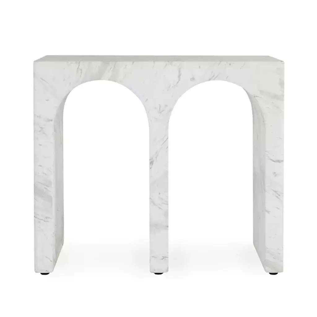 The Marmo Outdoor End Table from Classic Home incorporates graceful arches reminiscent of classical architecture within its contemporary form. Artisan-crafted from glass fiber reinforced concrete, each piece receives individually hand-applied stone patterning, ensuring no two tables are exactly alike. The remarkable durability of the material withstands temperatures exceeding 120°F and repels moisture without damage. Its stain-resistant surface requires minimal maintenance, making it ideal for indoor and outdoor living spaces. The timeless design offers a perfect perch for drinks, plants, or lanterns.