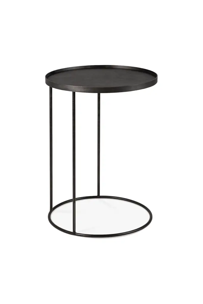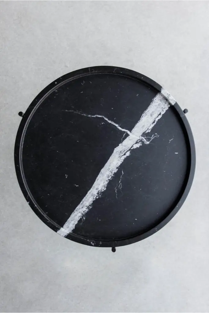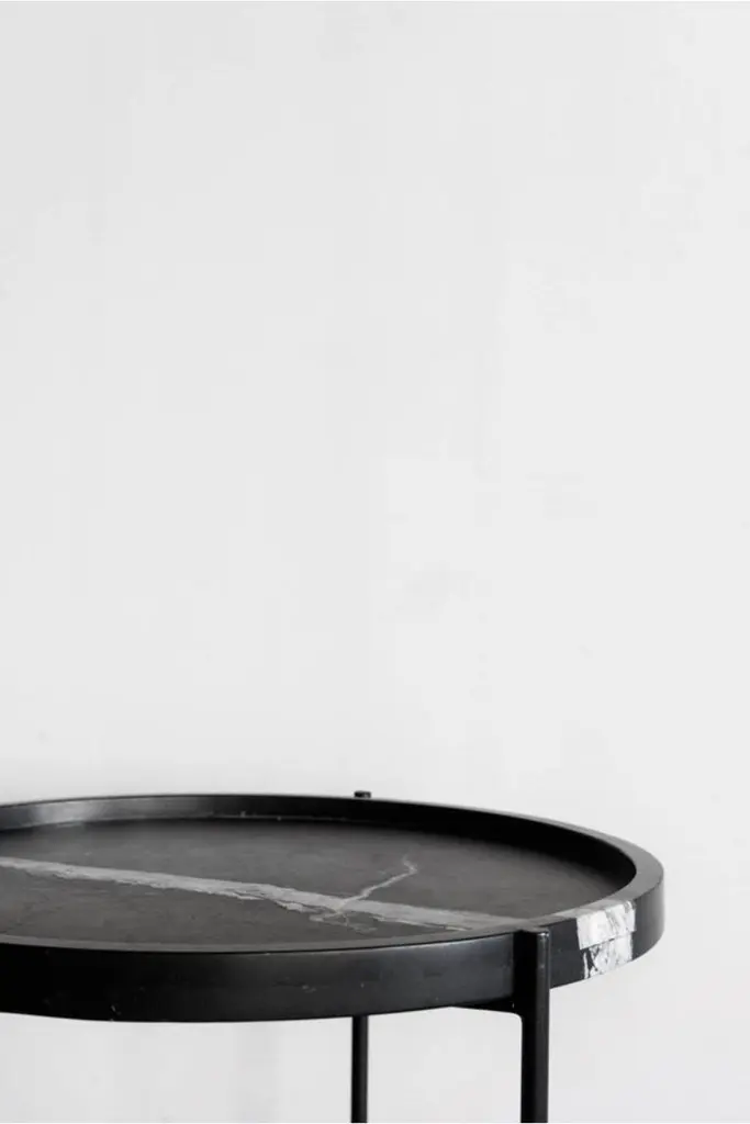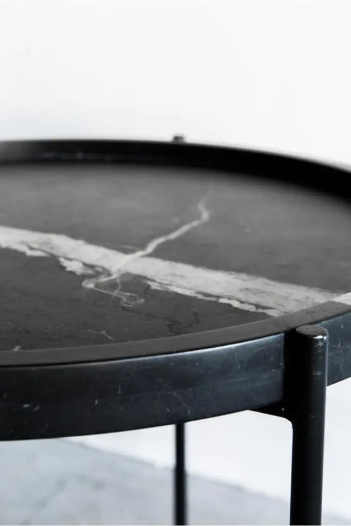 The Marquina Side Table is a sophisticated, minimalist accent piece. The honed Nero Marquina marble top features a stacked edge that creates a subtle rim, while the thin matte black base made of round stock steel adds an understated refinement to the piece.Fissures, small cracks, areas of cloudiness and other organic characteristics occur naturally within marble. Organic characteristics are to be expected. The veins are unique to each piece, orientation, color and pattern of veining cannot be customized. General signs of wear, exposure to elements, or organic characteristics in the marble are not considered craftsmanship errors. Handcrafted in Los Angeles, California by a small and dedicated team, the Marquina Side Table is made to order to ensure that every piece we build meets the unique needs and preferences of the customer.INDUSTRIAL STEEL + NERO MARQUINA MARBLE, POLY + HONED FINISH PERSONALIZE THIS PIECE: specializes in handmade, quality furniture to fit your space. Each piece is made to order in our downtown Los Angeles workroom which allows for a truly tailored experience. Personalization can include a change in size, orientation, design elements and much more. We offer a variety of leather and fabric options and welcome COM, COL and COH (for trade members only). The specific customization options available will depend on the product.For all furniture, protection from heat and moisture is crucial to the longevity of the piece. To help prevent scratches, use adhesive felt pads, coasters, placemats, and avoid sliding objects across the surface of the piece when possible.Lacquer + Paint + Metal Surfaces - Dry dust with a clean microfiber or feather duster. Wipe with a slightly damp microfiber towel and mild cleaner as needed. Wipe dry promptly. We recommend that you clean with ammonia-free Windex or a mild surface cleaner. Please stay away from bleach, alcohol, or petroleum based cleaners. You may use a general purpose wood cleaner.Avoid using furniture polish as over time it can accumulate and leave a residue.Wax + Oil Finish - Dry dust with a clean microfiber or feather duster. Wipe with a slightly damp microfiber towel. Wipe dry immediately. Clean with ammonia-free Windex or a mild surface cleaner. Stay away from bleach, alcohol, or petroleum based cleaners. Our natural wax and oil finishes will dull over time. Wax or teak oil may be reapplied as needed using a soft white cloth. Raw Wood Dry dust with a clean microfiber or feather duster. Use a damp microfiber towel or soft brush as needed. Do not use any product containing wax or oil to clean.Outdoor Furniture - Outdoor furniture may require frequent oiling. A cover is strongly recommended for all outdoor furniture. Avoid prolonged exposure to moisture and/or direct sunlight. If exposed to rain, allow cushions to air dry completely before putting them back on the frame. Leather Care - Dry dust with a clean microfiber or feather duster. Wipe with a slightly damp microfiber towel. Do not use cleaning products on the leather. The recommended leather conditioner is Skidmore’s Original Leather Cream. Marble + Stone - Dry dust with a clean microfiber or feather duster. Wipe with a slightly damp microfiber towel. Wipe dry immediately. For daily cleaning we recommend using Orange Glo and/or Method Stone Cleaner on the marble. All marble and stone surfaces are protected with a sealer. To maintain the overall appearance and protection of the marble or stone, reseal with Miracle 511 Seal & Enhance. It is important to use coasters and clean up moisture immediately on marble and stone surfaces.Additional information:Dimension: 24"DIA + 24"H 175LBS