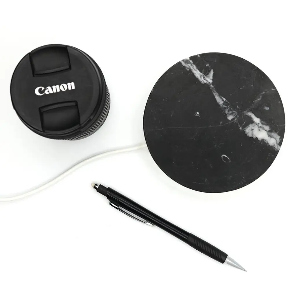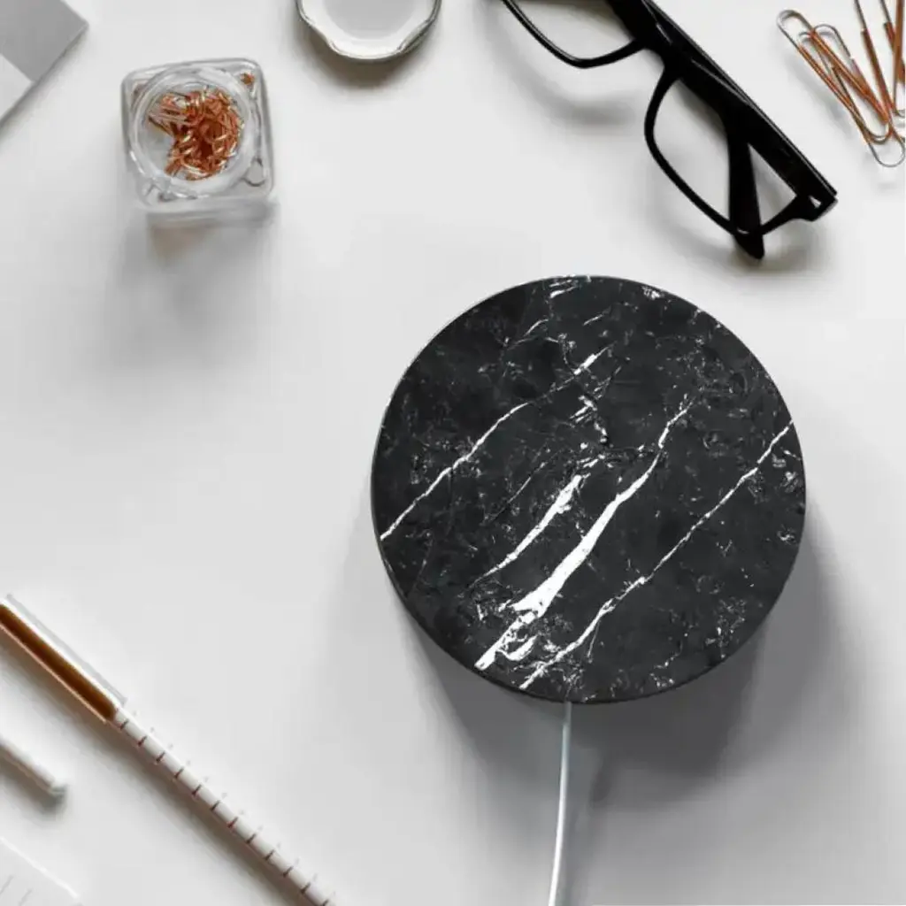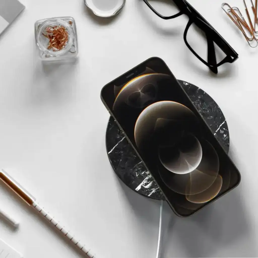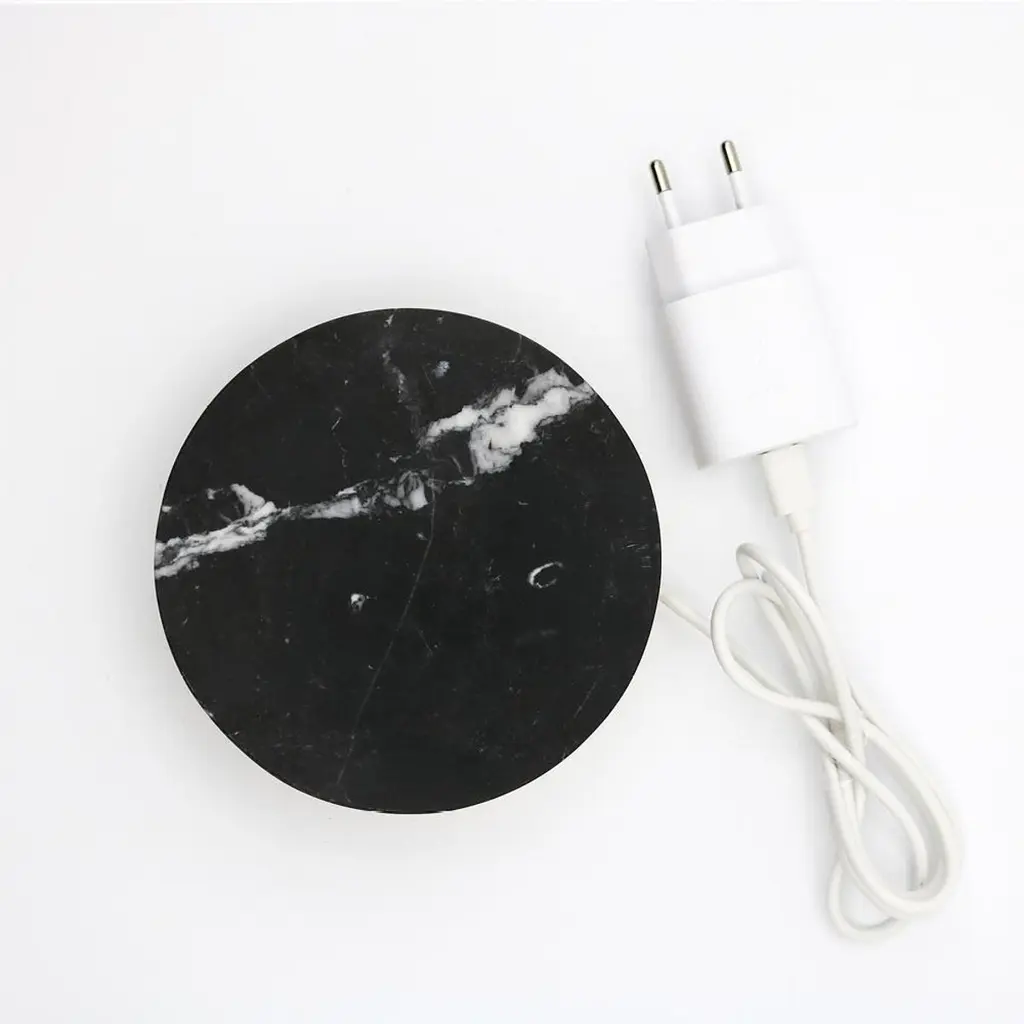 A marble base,that quickly charge your phone, with a touch of magic. A circle, a stone, realized with the care that marble requires.A powerful wireless charging technology ensures an efficient and reliable power delivery.The result is a magical object, with a natural feel,a piece of art that wonderfully fits on any table or bedside table,or everywhere you imagine.Designed and manufactured in Italy, 100% Italian marble, 0% plastics.- 15w power supply included in the box.- Measures: Integrated cable: 90cm (3ft)- Base diameter Ø 12cm (4.72in) Compatible with all Qi-enabled devices.