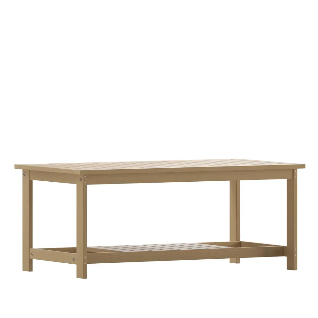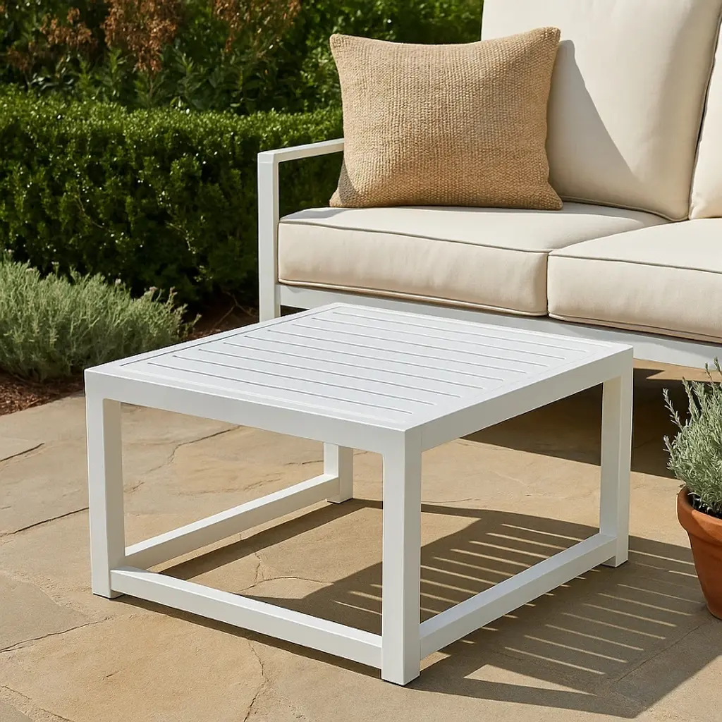 This low patio coffee table brings friends and family together on your deck or in your yard for bubbly drinks and conversation. It's crafted from aluminum and an open work base with four straight legs that establish a streamlined look. The tabletop has a slatted design that's a contemporary take on a classic picnic table. At 16'' tall, it's the perfect size for a coffee table with your sofa or for sitting around with comfy cushions on the floor (sold separately). We love that it's weather-resistant for holding up to everyday use outside.