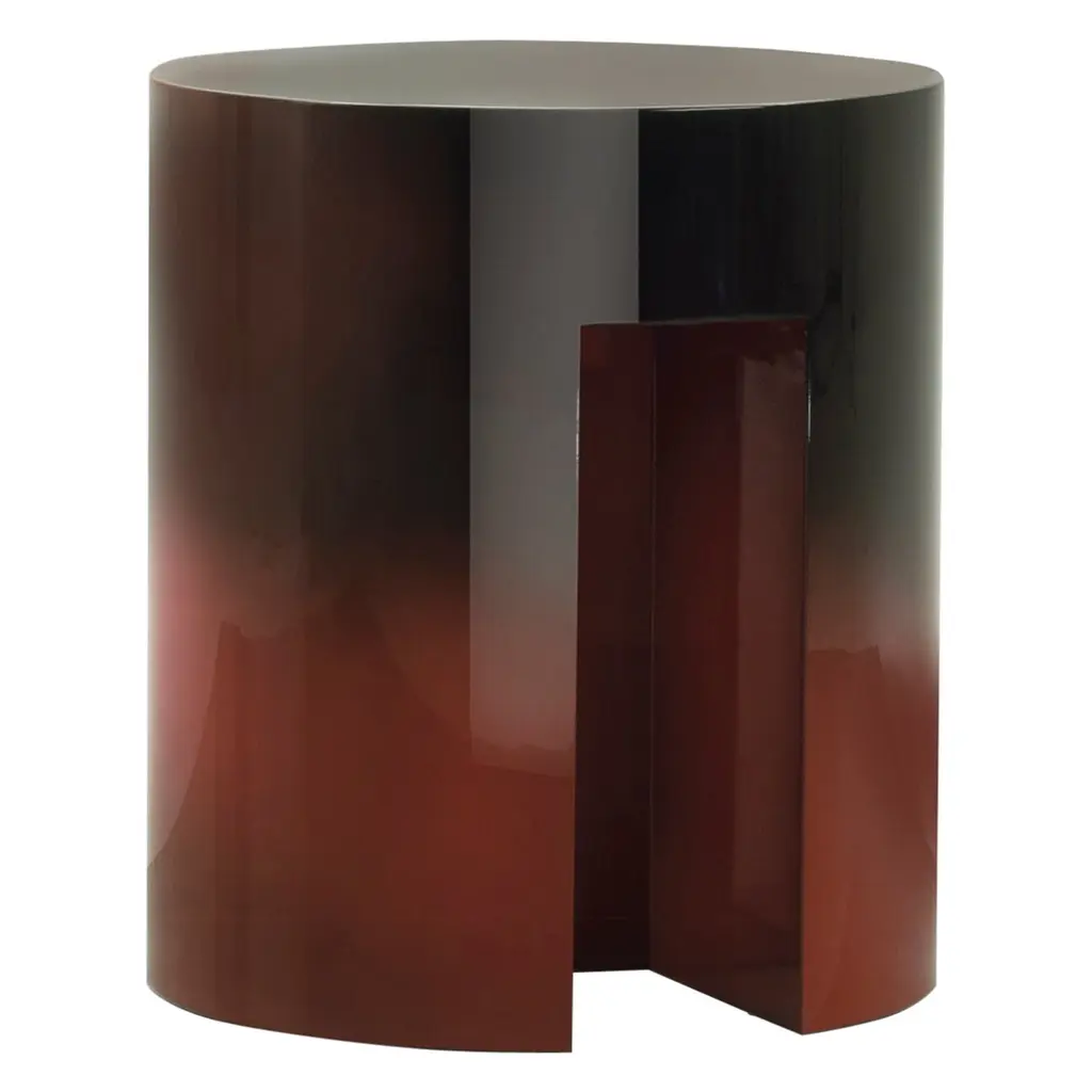 A set of small tables characterized by a peculiar shaded lacquer and a simple gesture that by cutting cylindrical volumes creates the object by subtraction. A small family designed by playing on different circumferences, heights, and colors. Monolithic structure composed of lightened mdf. Nuanced Brown-red polyester lacquered high gloss finish. More finishes are available, please contact the concierge for more information.