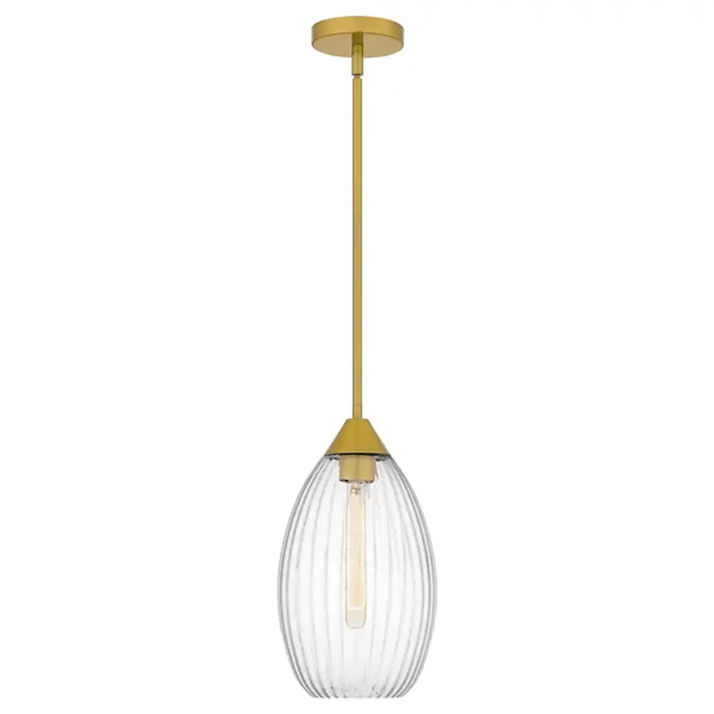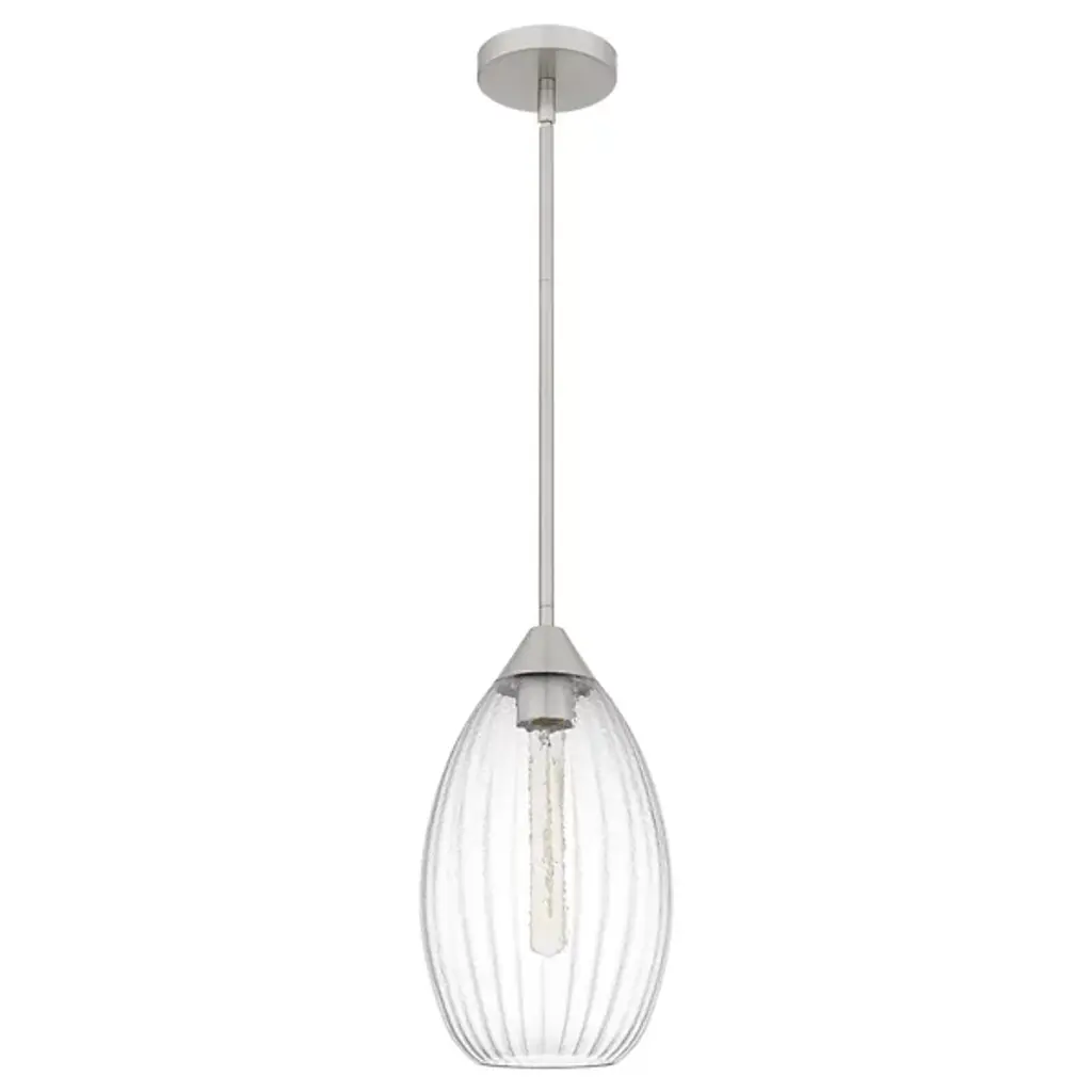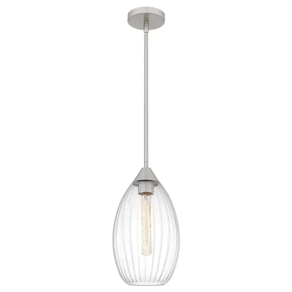 The Marza Pendant from Quoizel is a glistening jewel of illumination, suspended in mid-air. This dimmable interior lighting fixture showcases a teardrop-shaped shade of clear, ribbed glass. Each delicate ridge in the glass creates a prism effect, scattering soft beams across your space like a gentle rainfall of light. The luminaire appears to float effortlessly from a sleek brushed steel canopy and slender cord. The pendant's compact size makes it ideal for clustered arrangements over kitchen islands, bathroom vanities, or bedside tables.