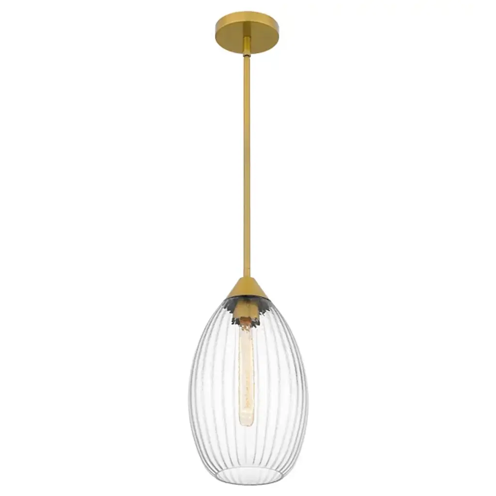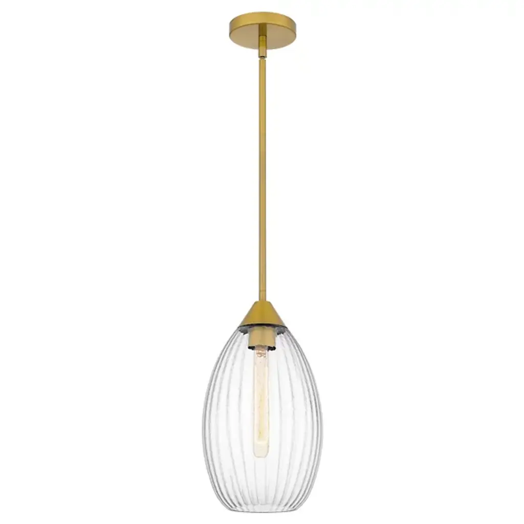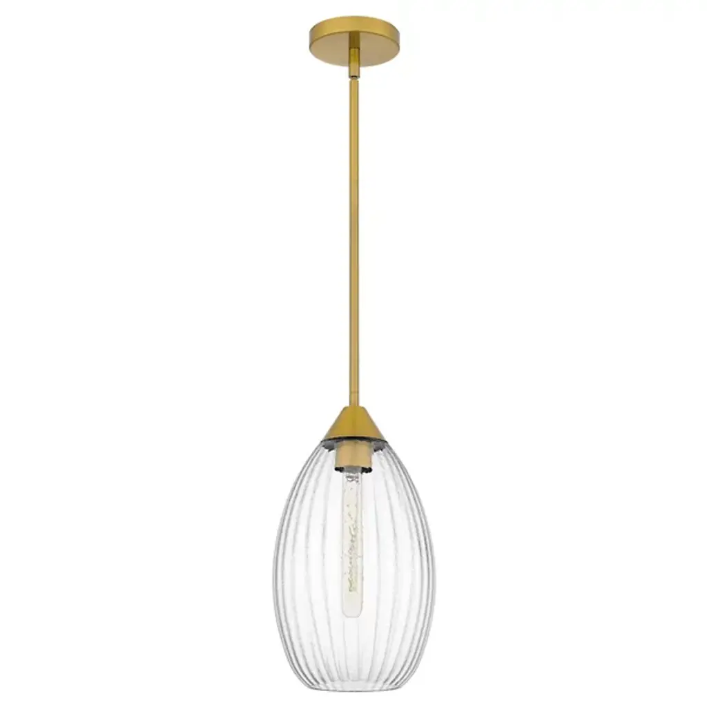The Marza Pendant from Quoizel is a glistening jewel of illumination, suspended in mid-air. This dimmable interior lighting fixture showcases a teardrop-shaped shade of clear, ribbed glass. Each delicate ridge in the glass creates a prism effect, scattering soft beams across your space like a gentle rainfall of light. The luminaire appears to float effortlessly from a sleek brushed steel canopy and slender cord. The pendant's compact size makes it ideal for clustered arrangements over kitchen islands, bathroom vanities, or bedside tables.