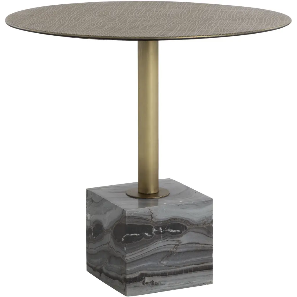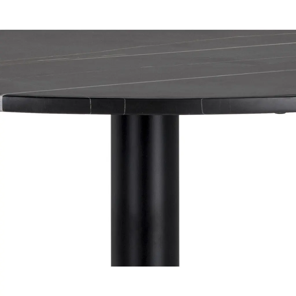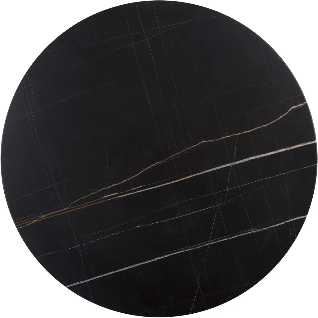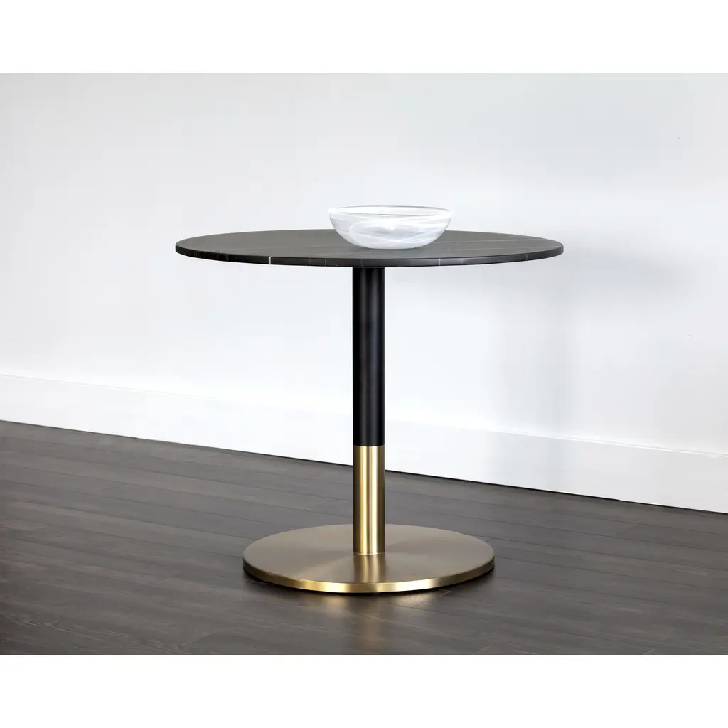 A round bistro table inspired by Art Deco luxury. Features a matte black marble top with striking gold and white veining and a black and gold steel base. Perfect for small kitchen and dining spaces. As marble is a natural material, unique veining, pitting, fissures, micro-cracks and colour variations are all characteristics that add to the uniqueness and beauty of each piece.