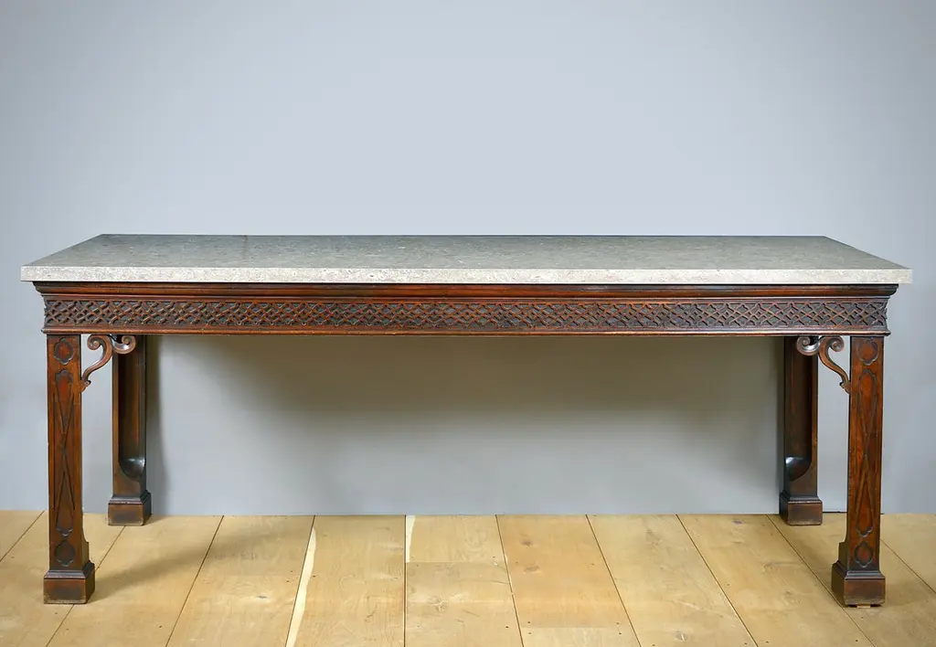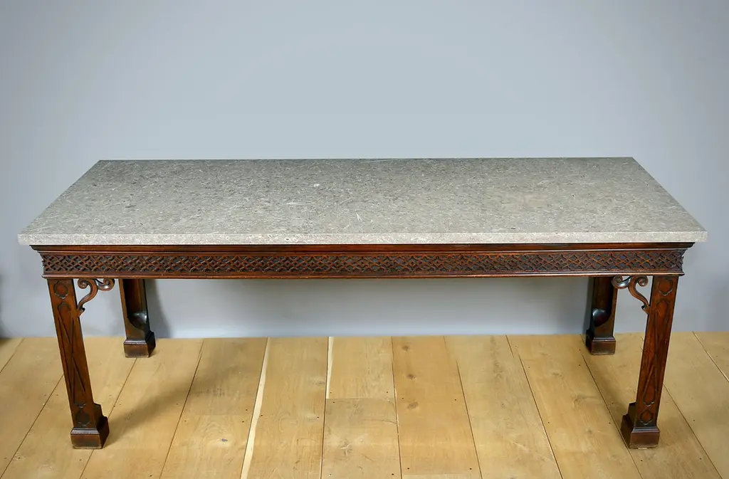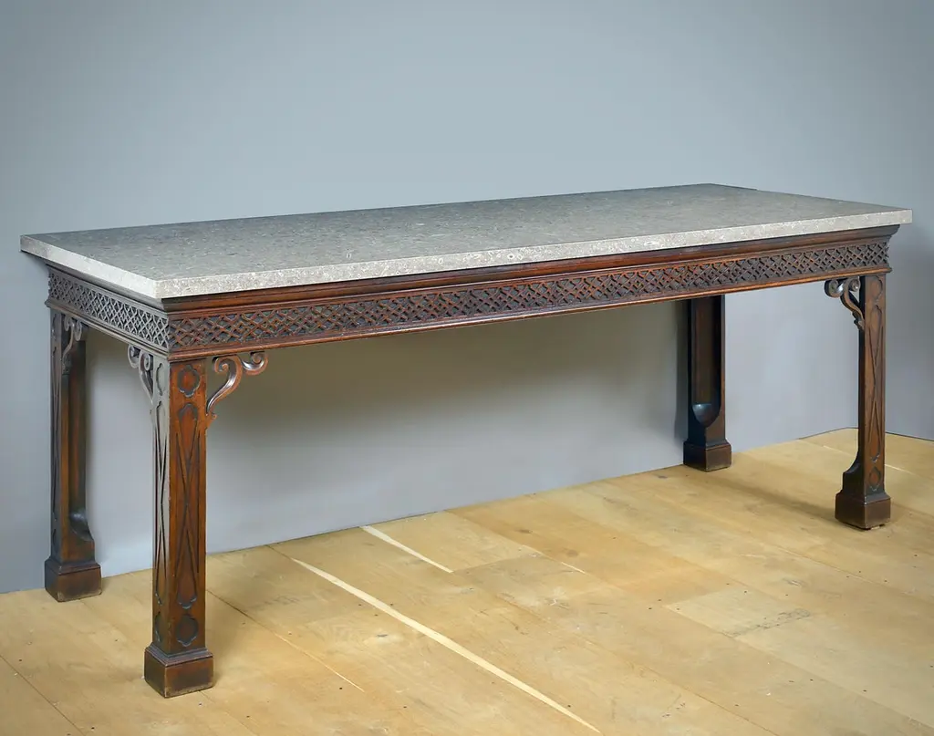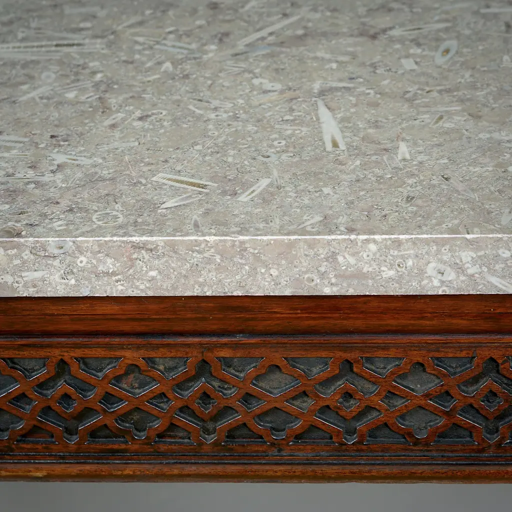 A MASSIVE GEORGE II MAHOGANY SIDE TABLE AFTER A DESIGN BY THOMAS CHIPPENDALE, POSSIBLY BY ALEXANDER PETER, CIRCA 1755-60.With later Derbyshire fossil slab.