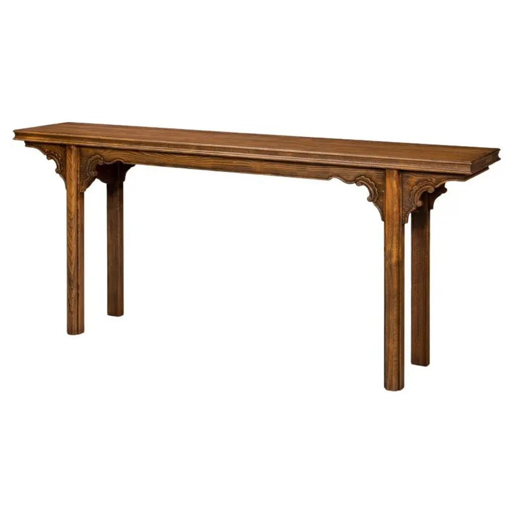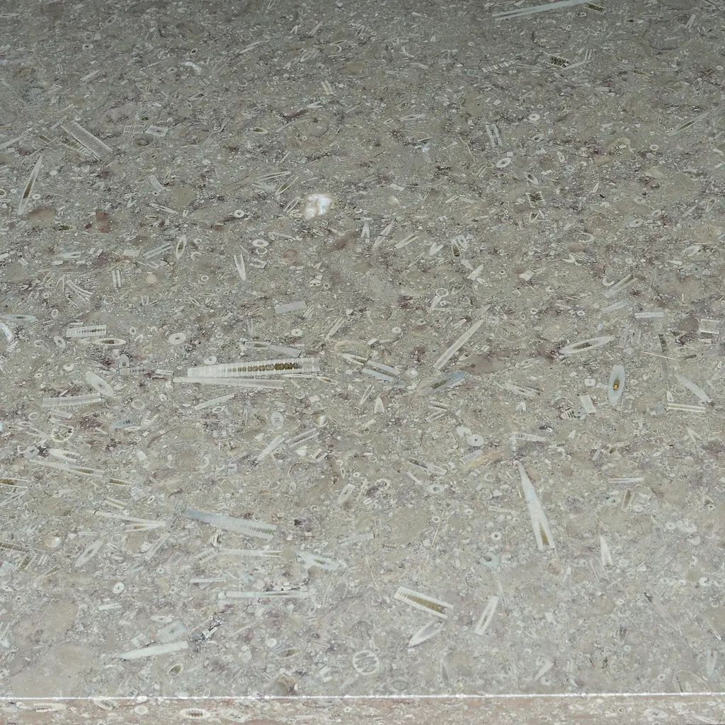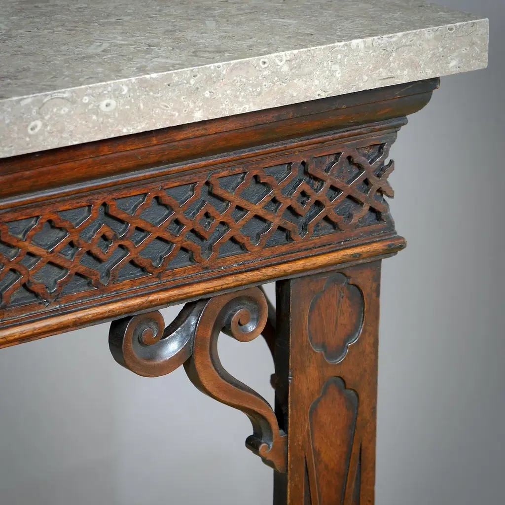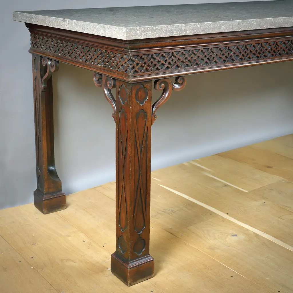 A MASSIVE GEORGE II MAHOGANY SIDE TABLE AFTER A DESIGN BY THOMAS CHIPPENDALE, POSSIBLY BY ALEXANDER PETER, CIRCA 1755-60.With later Derbyshire fossil slab.