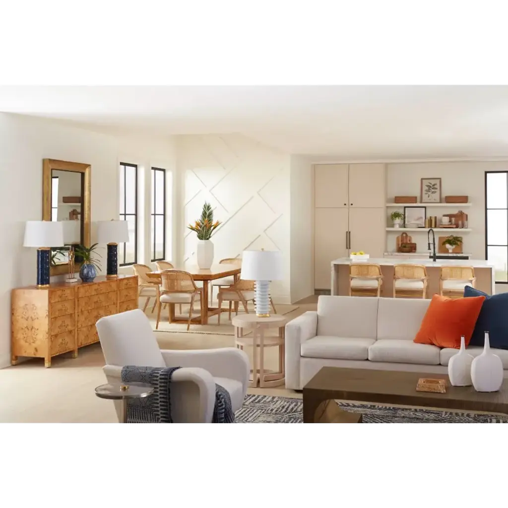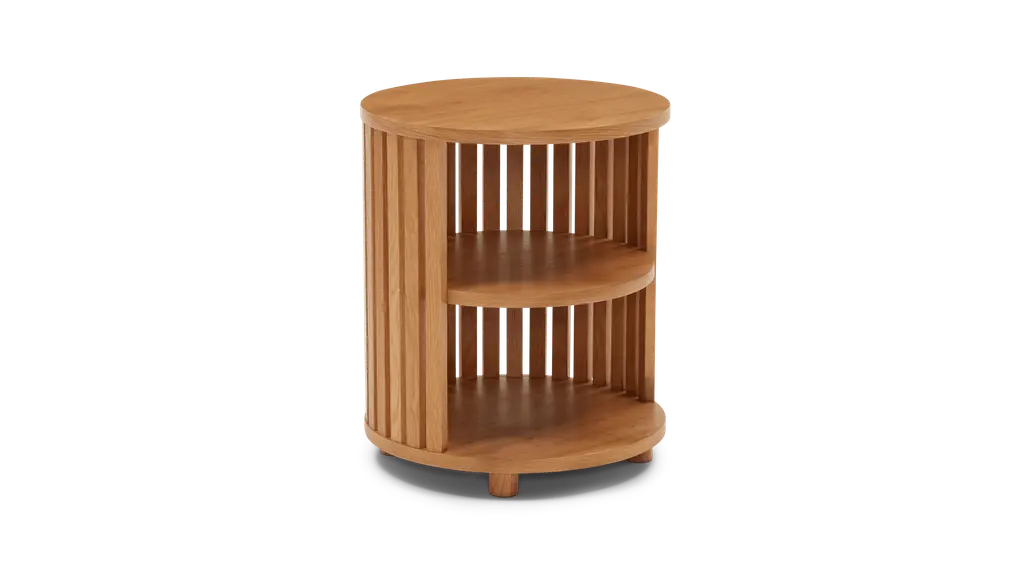 The Mateo Collection features a "mod" looking curved geometric design that effortlessly draws the eye and adds a sense of chic to any living space. Crafted using gorgeous oak veneers that have been lacquered with a clear coat, the Mateo Side Table features a single shelf exudes stylishness. This piece promises both reliability and enjoyment for years to come.