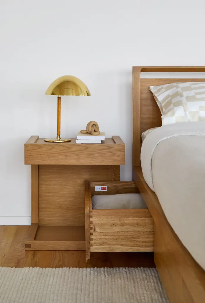 The Matera Collection (2007), focused on delivering ample storage, is the work of Sean Yoo, who at the time of its conception lived in Matera, Italy. His Matera Bedside Table (2007) features clean lines nicely finished with beveled edges, running match-wood grain, and exposed-slot mortise-and-tenon corner joints. It's C-shaped, with a compact footprint and open body that allows the drawer of the Matera Bed with Storage to pass right through it when placed beside it. Made in Malaysia.