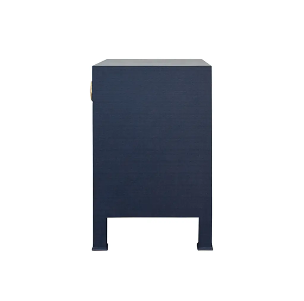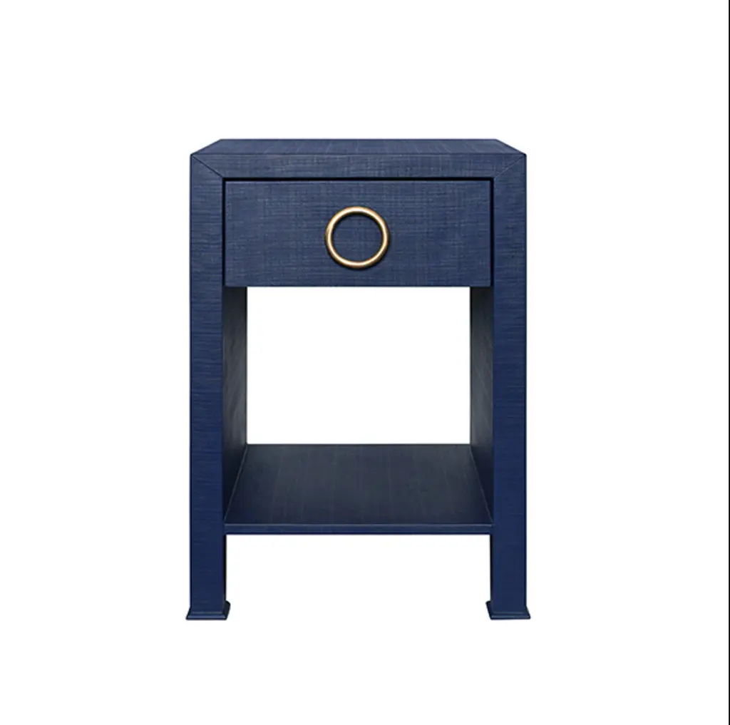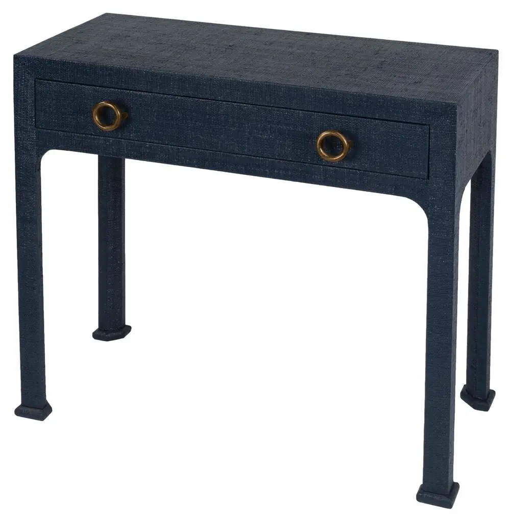 The Malcolm one drawer side table is both sophisticated and functional! Made of navy linen and an antique brass ring draw pull. Perfect for storing remote controls, small books, and more. It's practical and elegant. Dimensions: 29"H x 20"W x 18"D Also available in natural grasscloth or green grasscloth. See separate listings.