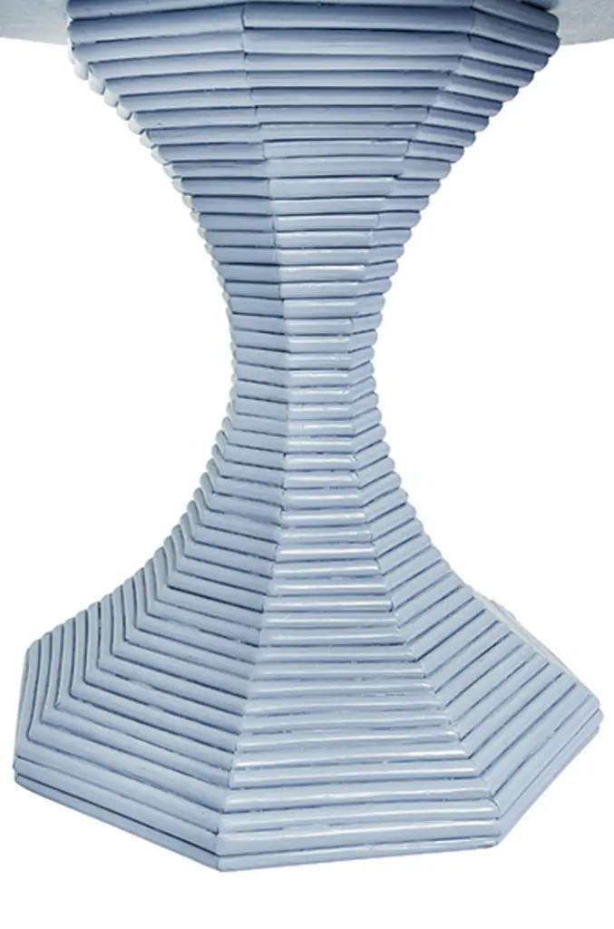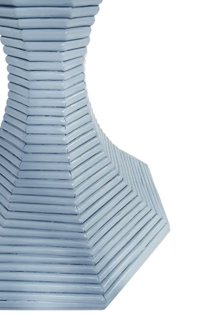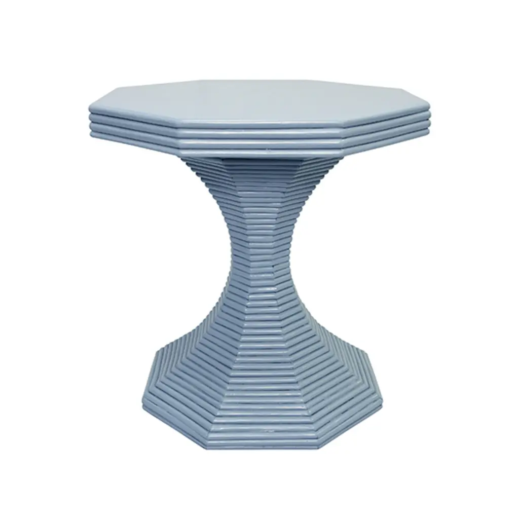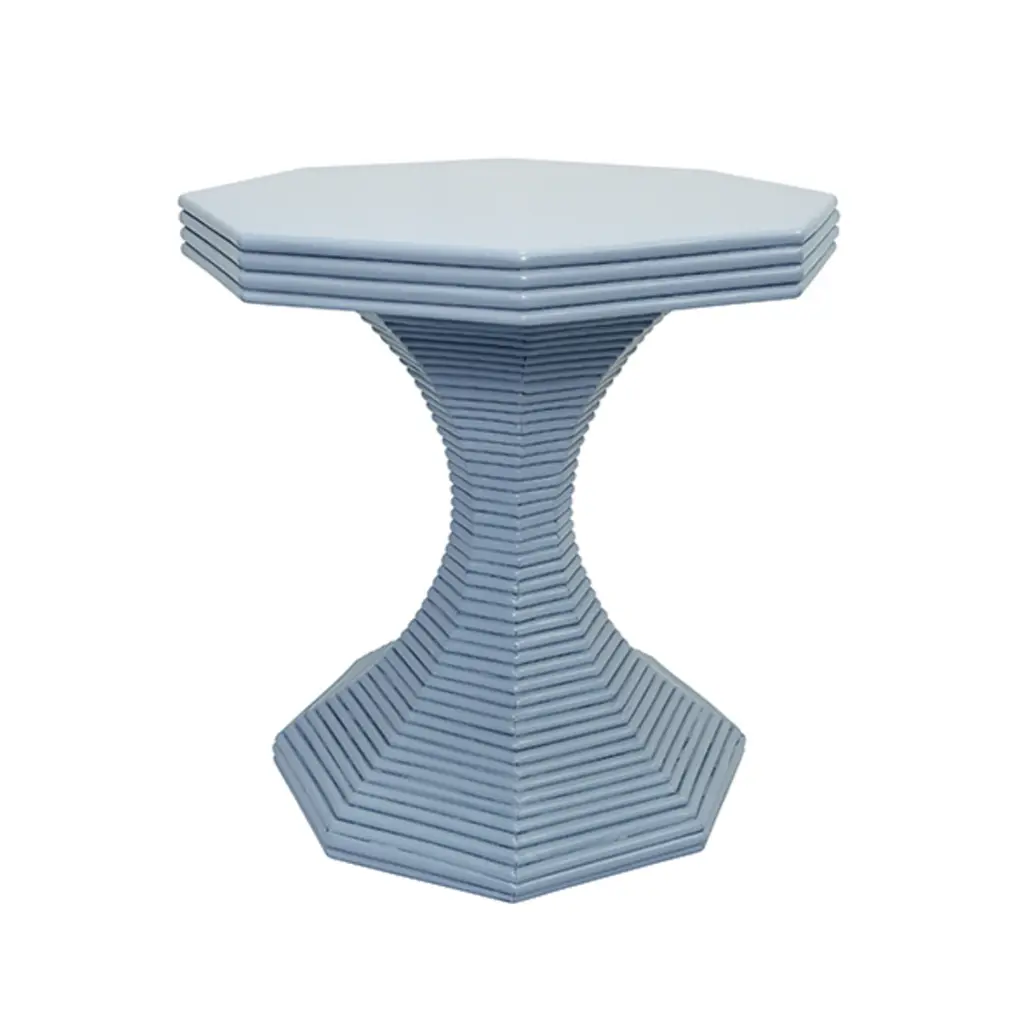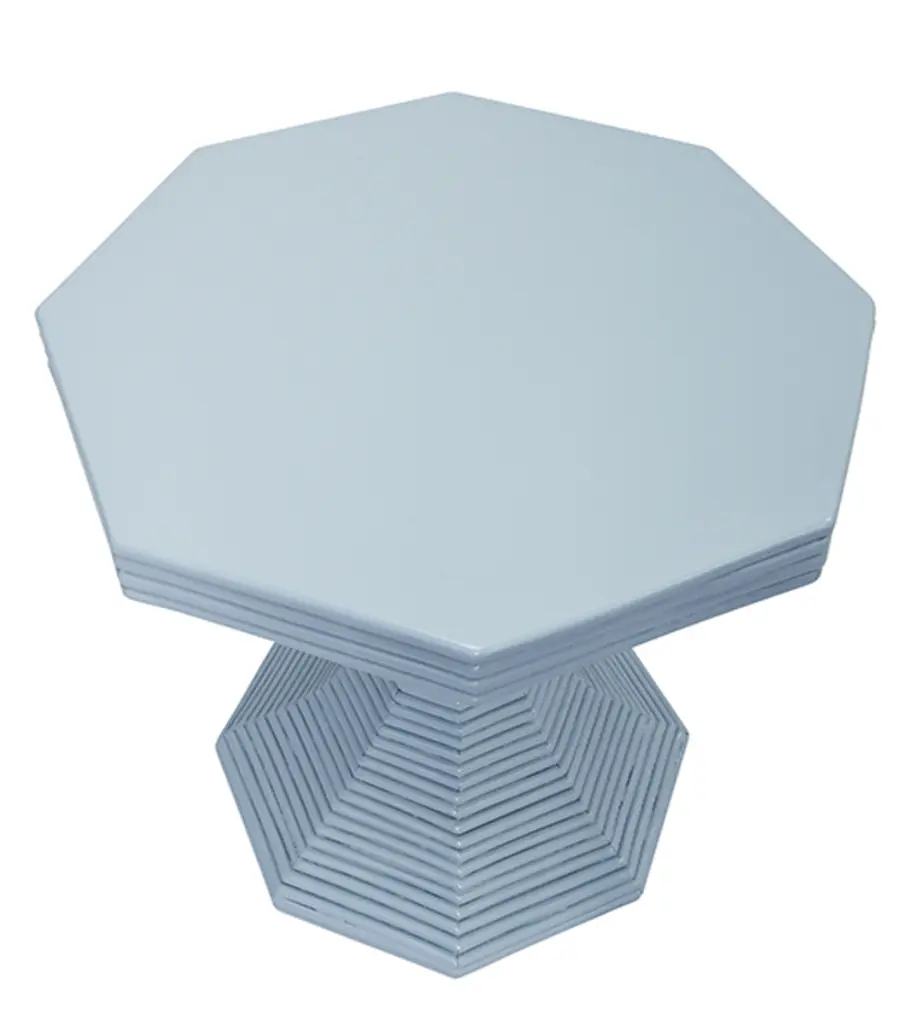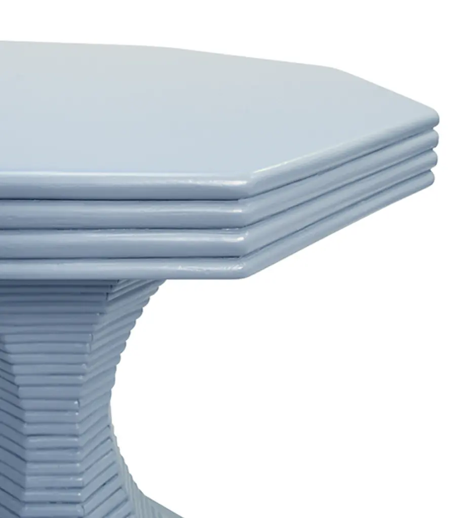 Introducing our Octavia table, featuring a playful octagonal shape and reeded rattan craftsmanship, all painted in a whimsical light blue. This unique piece is sure to add both style and function to your space. 24.25" DIA *Rattan has natural variations and may differ slightly between panels. Height: 23.50"
