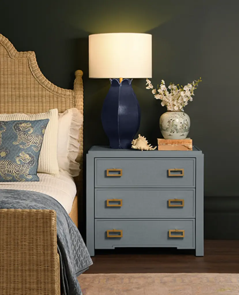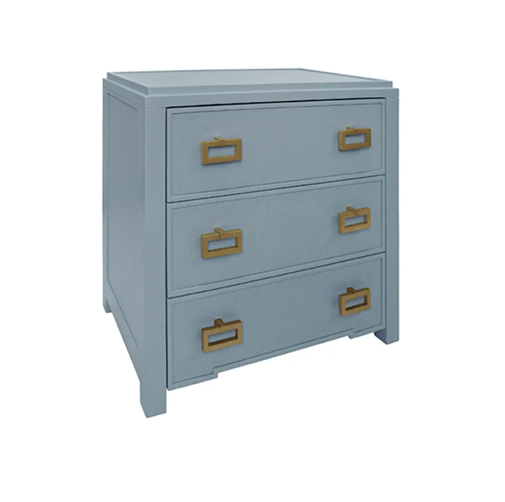 Matthew Izzo Home - Radley Light Blue Grasscloth And Matte Lacquer Three Drawer Side Table With Satin Brass Drawer Pulls