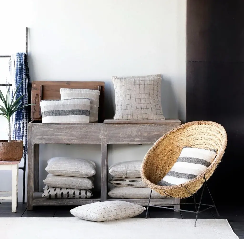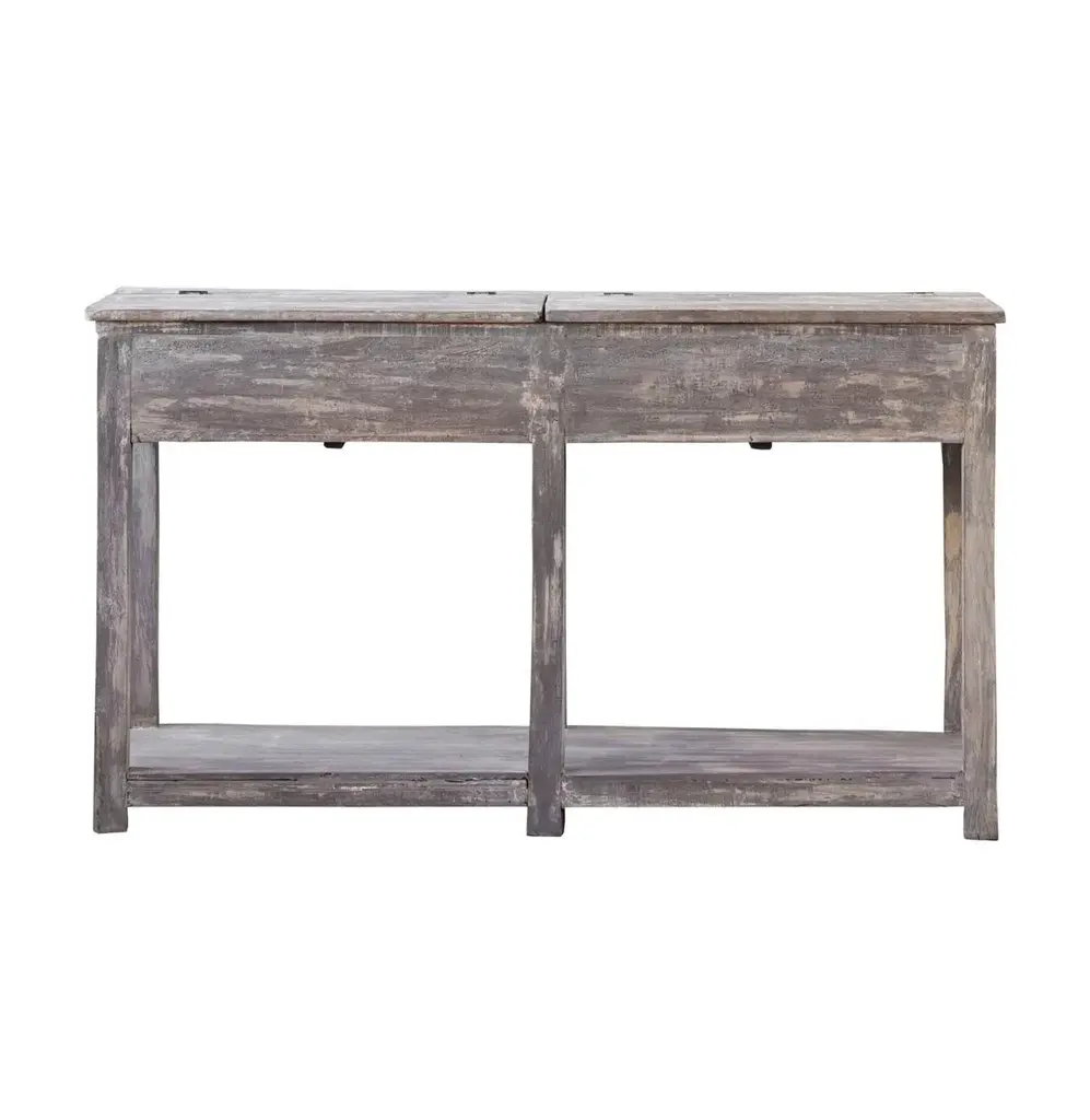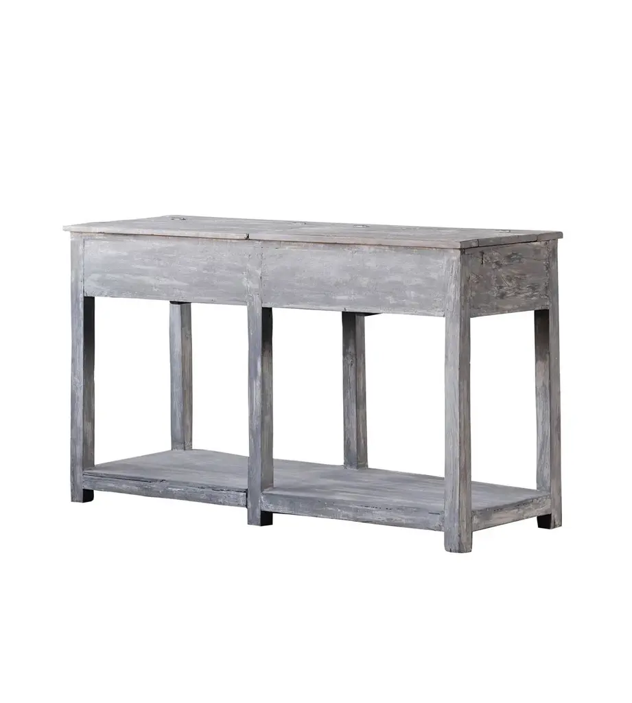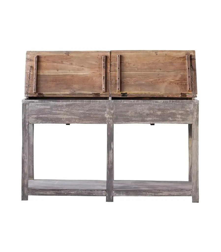 Taking old accent tables sourced from India, we creatively upcycled each to create the Vintage Teak Console with Storage. Fitting two tables of equal size together, we adjusted their tabletop to be a liftable lid that can store items out of site. The open base is fitted with matching vintage teak wood to offer a sturdy lower display shelf. The Vintage Teak Console with Storage is then finished in a gray wash.