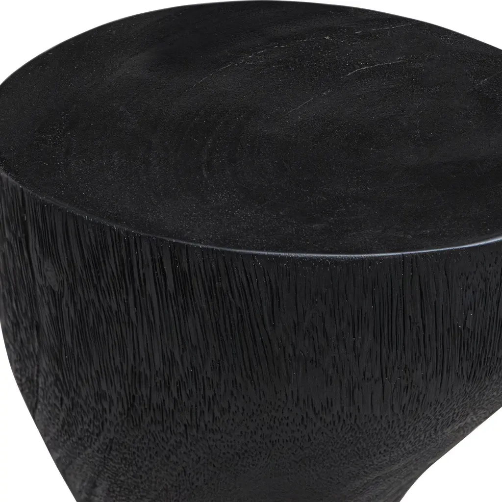 The Mattison Drink Table Showcases An Unconventional Hourglass Silhouette Crafted Entirely From Teakwood. The Sleek Black Glossy Tabletop Provides A Striking Contrast To The Matte Black Finish Of The Body, Creating A Perfect Balance Of Modern Sophistication. Solid Wood Will Continue To Move With Temperature And Humidity Changes, Which Can Result In Cracks And Uneven Surfaces, Adding To Its Authenticity And Character.