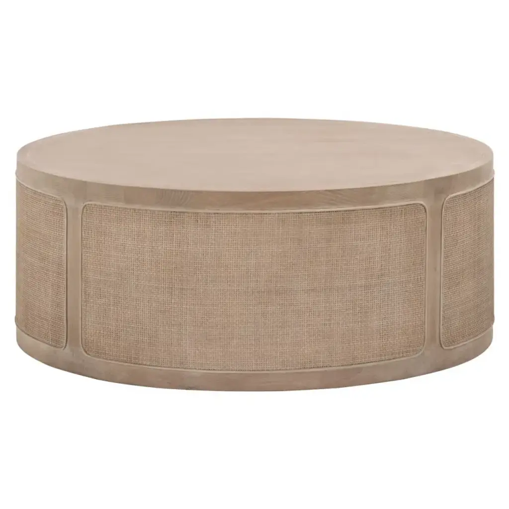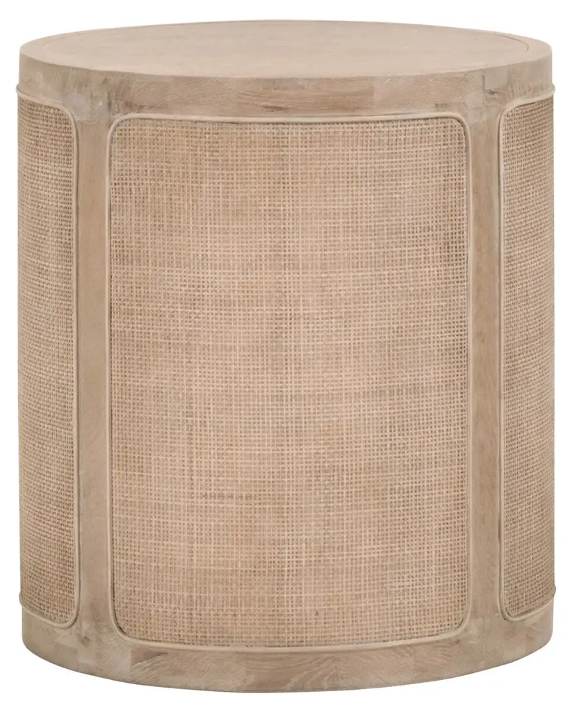 Both breezy and refined, this round end table is crafted of durable, distinctively grained oak with wood-backed woven cane inlays providing textural contrast and a hint of tropical ease..