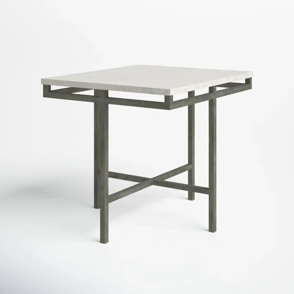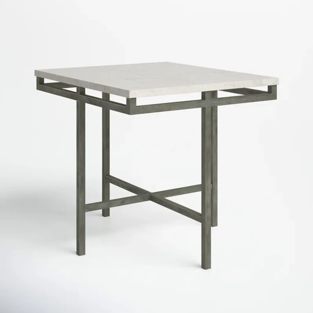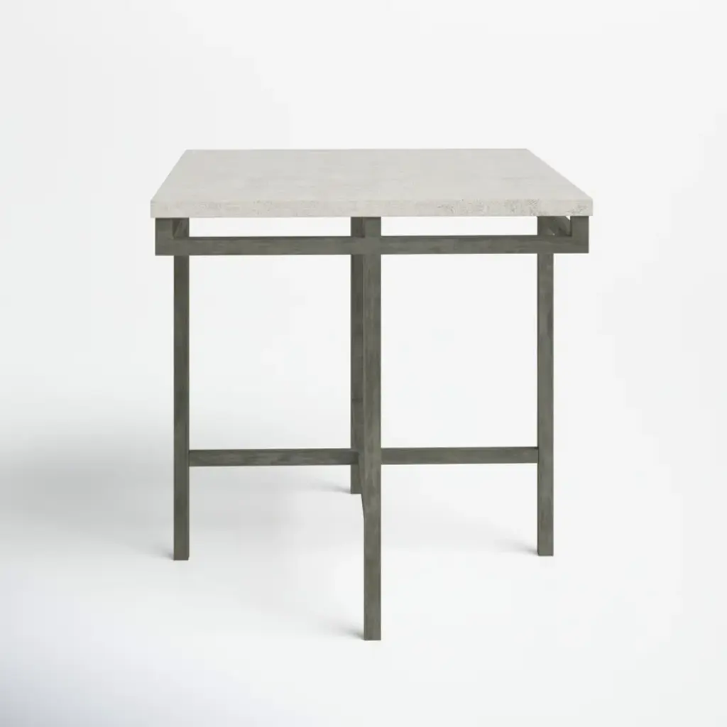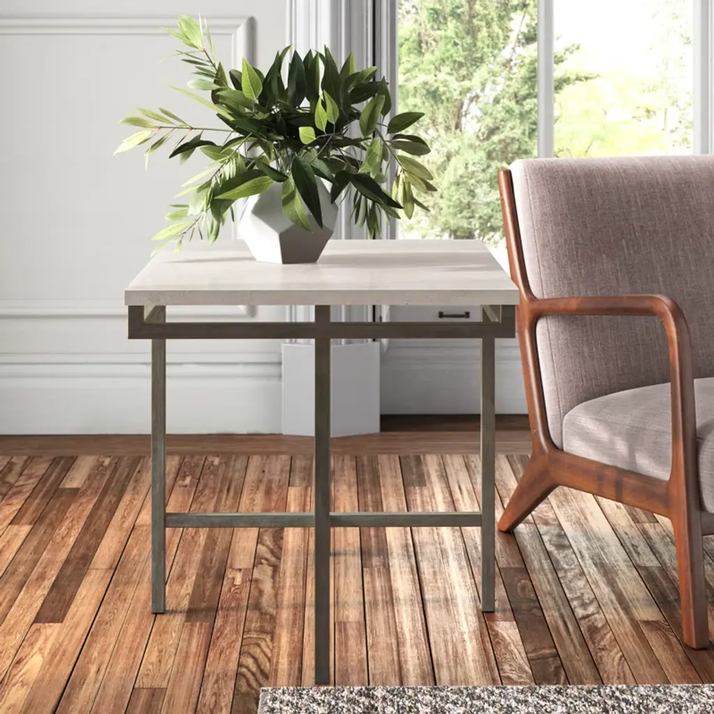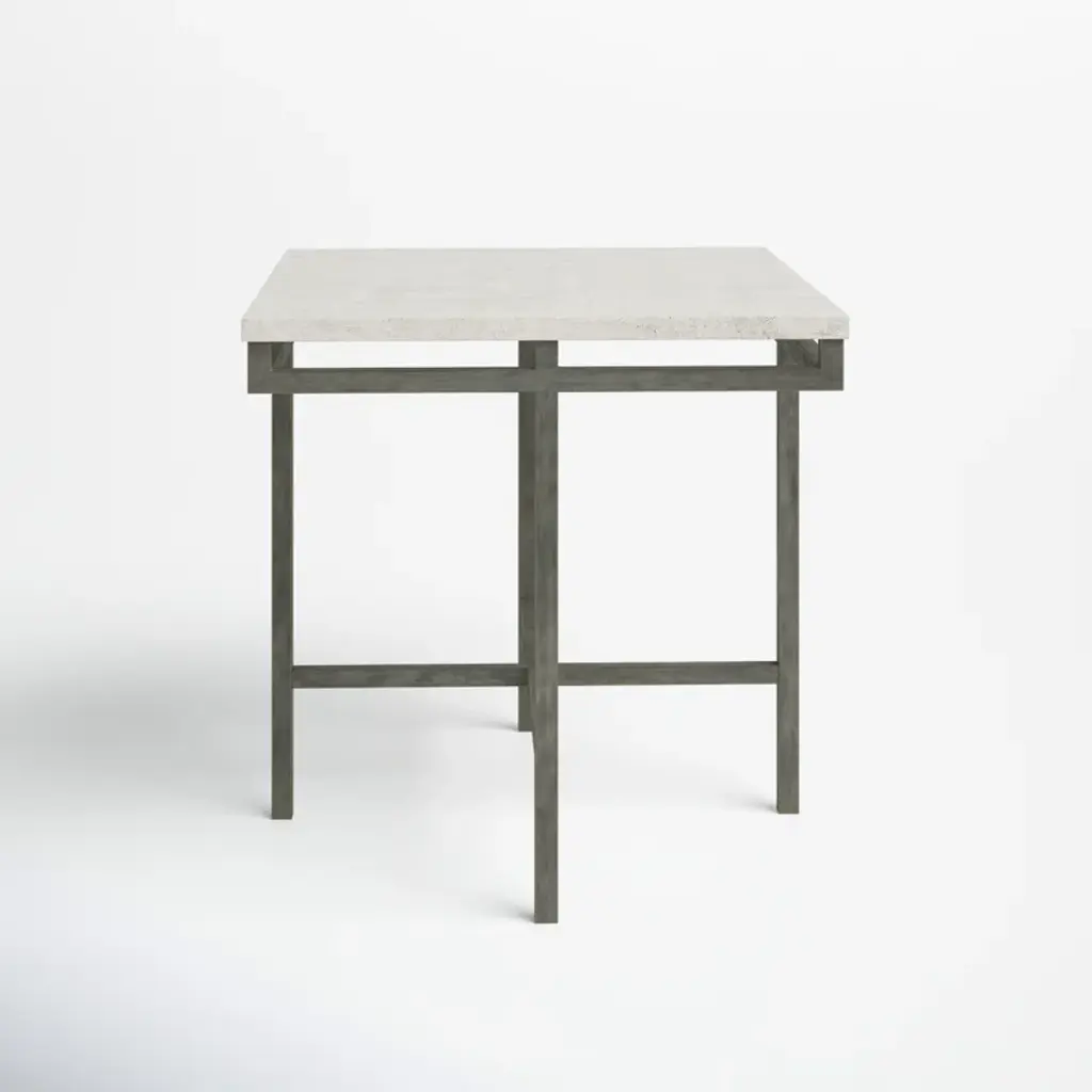 Portraying the beauty of the modern design, This stunning end table was inspired by the horizontal linear cantilevering of the modern architectural era and features a simplistic pallet. Delightfully different, this end table has a unique base and a sophisticated travertine veneer top.