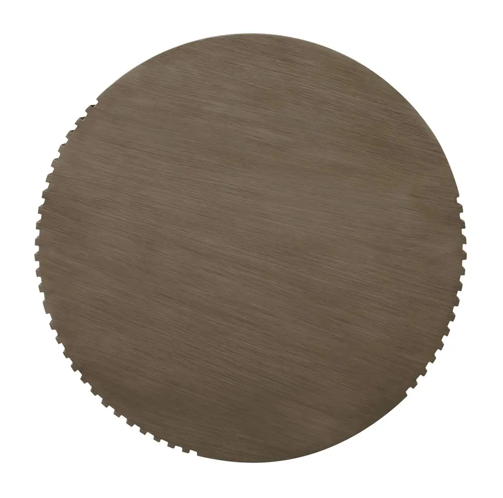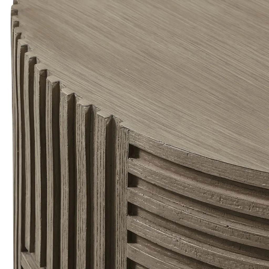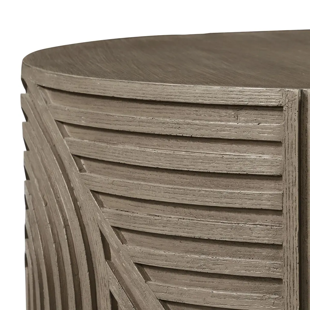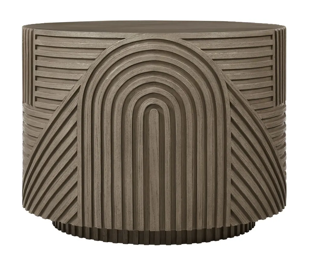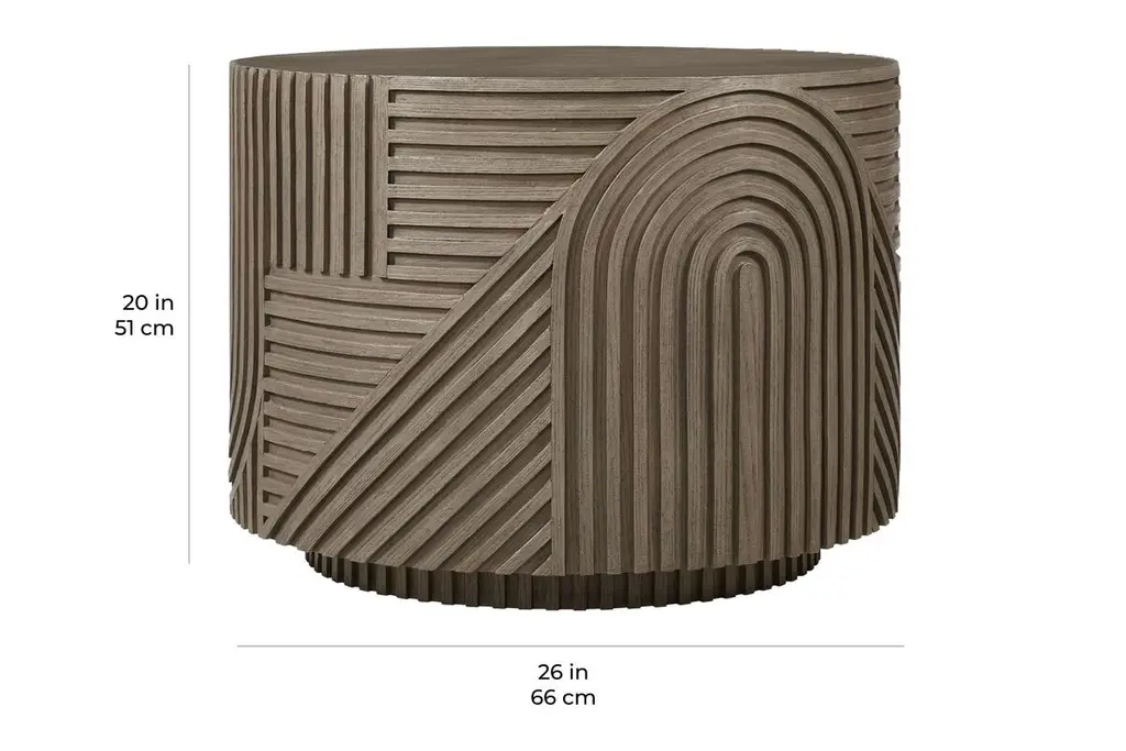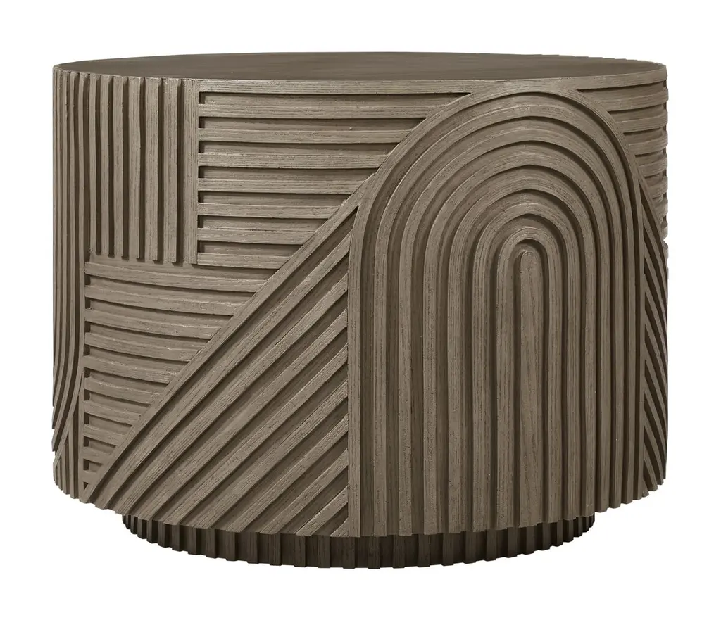 As durable as it is eye-catching, this side table is suitable for use outdoors as well as inside. Made of durable fiber-reinforced polymer around a steel core, the table has the appearance of wood, with ribbed geometric motifs along the sides. Adjustable nylon glides on the bottom will help protect your flooring.