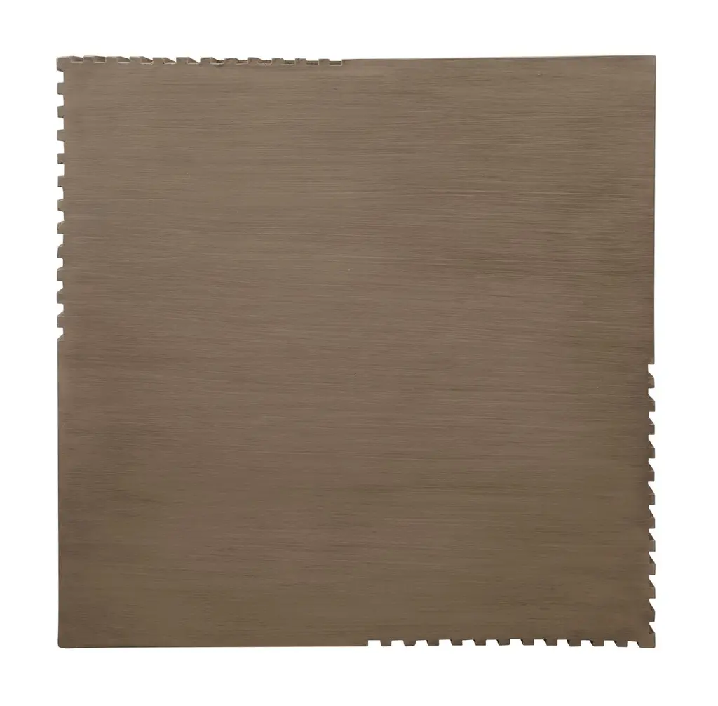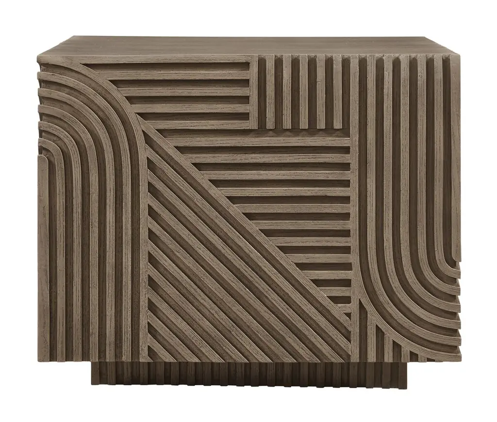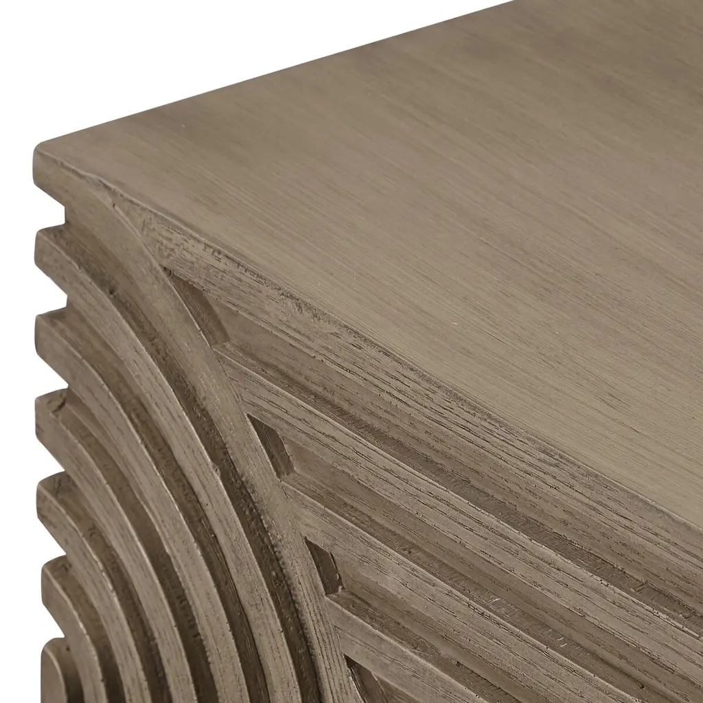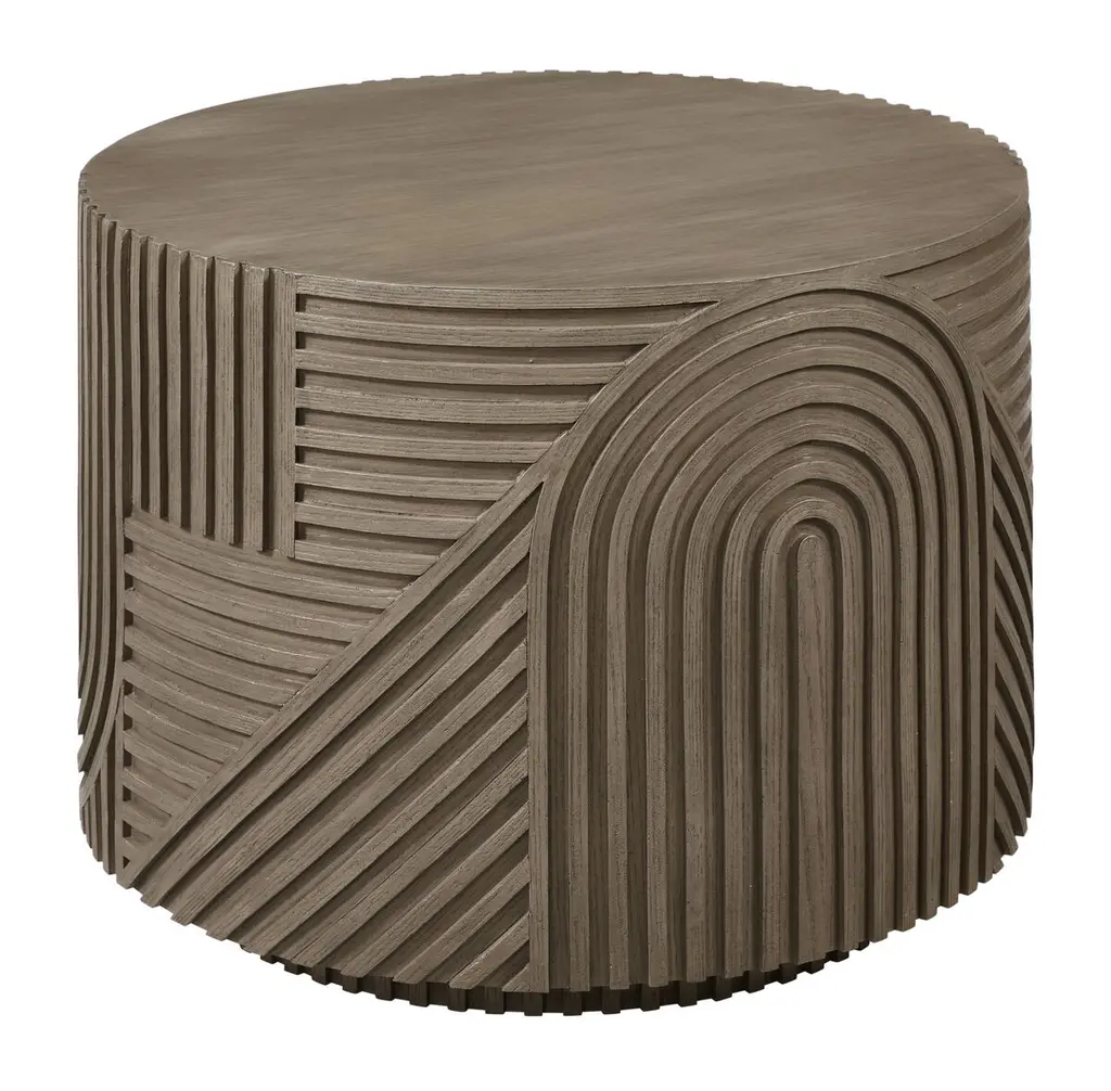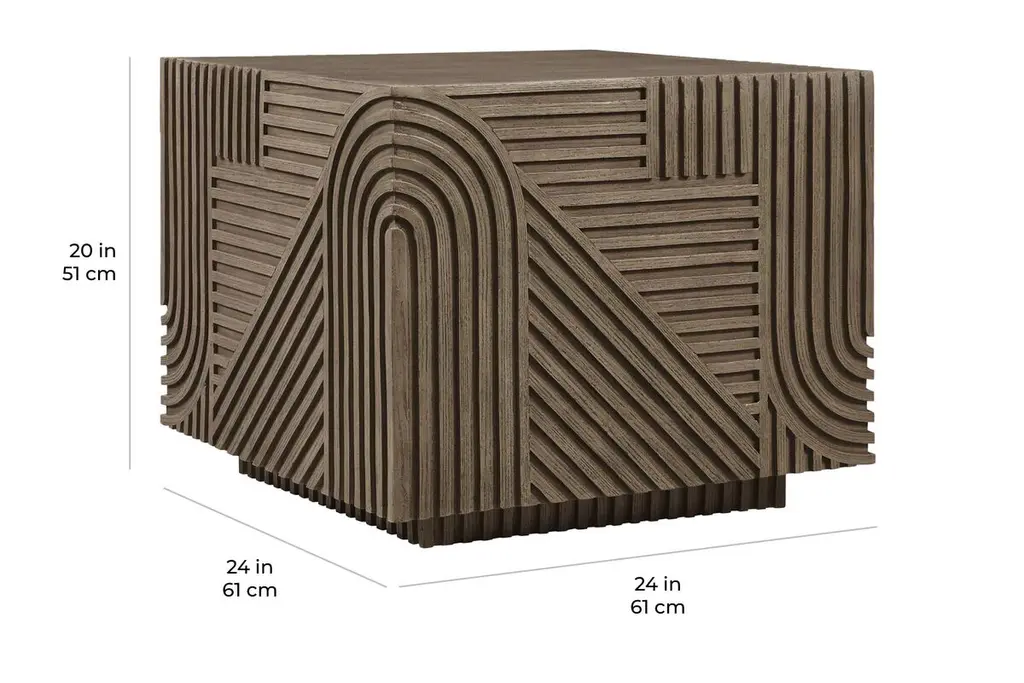 As durable as it is eye-catching, this side table is suitable for use outdoors as well as inside. Made of durable fiber-reinforced polymer around a steel core, the table has the appearance of wood, with ribbed geometric motifs along the sides. Adjustable nylon glides on the bottom will help protect your flooring.
