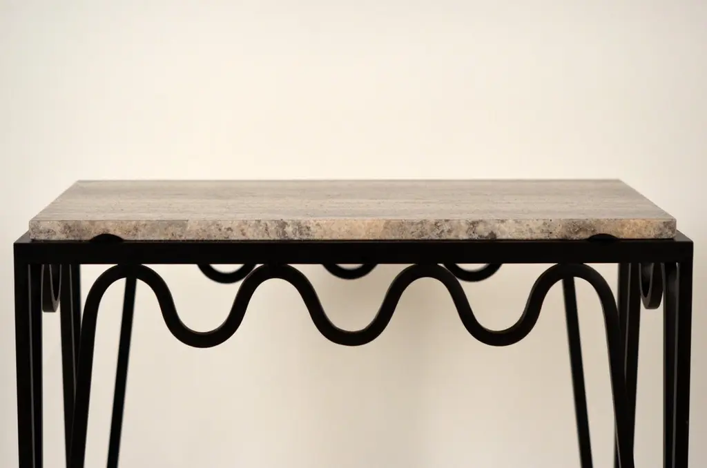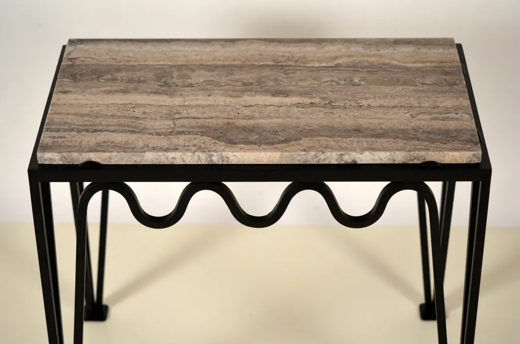 'Méandre' black iron and silver travertine side table by Design Frères.Chic and understated.