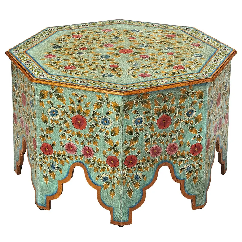 This is a 100% hand painted and hand carved Moroccan Octagonal shape side table or end table. Great handcraftsmanship throughout, featuring the famous Moroccan Zouak woodwork. Beautiful add-on to your home or office decor. This table measures approximately 19" in height, 15" from corner to corner.