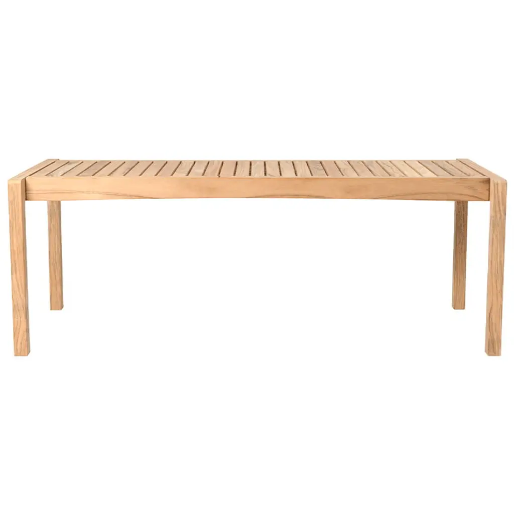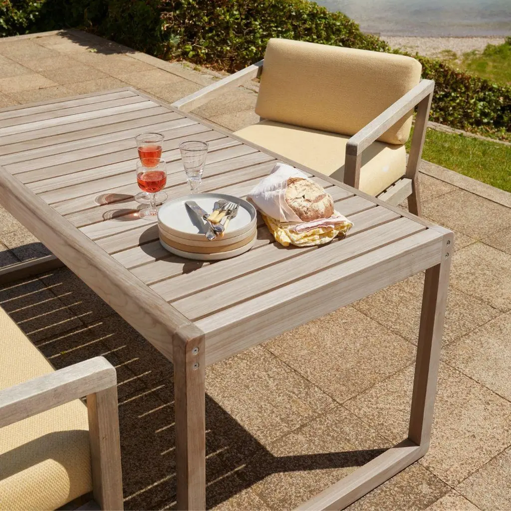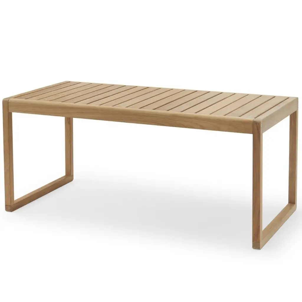 Medium outdoor 'Virkelyst' table in teak for SkagerakSkagerak was founded in 1976 by Jesper and Vibeke Panduro, who took inspiration from their love of Scandinavian design and its rich tradition. The brand emphasizes sustainability by using responsibly sourced materials and production methods that minimize waste and reduce environmental impact. Each piece of handcrafted furniture is designed to age with grace and last for generations.Virkelyst is a series of modern outdoor furniture with the comfort of indoor pieces. The simple wooden 100% FSC Certified teak frame features a slatted table top resting on two square frame legs and is offered in 3 sizes - the smallest of which can be used as a side table, foot stool, or a seat when needed. The largest size wonderfully accommodates outdoor dining when paired with other seating from the Virkelyst collection. Fabricated to the exacting standards of Skagerak using the highest quality materials available.Price per item. Available to order in unlimited quantities and in 3 sizes with varying heights - please see our separate listings. This listing is for the medium Virkelyst table.In stock lead time 2-3 weeks. Out of stock lead time can be an additional 3-4 weeks, or longer. Lead times and stock availability are subject to change at any time and without notice. Please inquire for current lead times prior to placing time sensitive orders.Made to order.All sales final.
