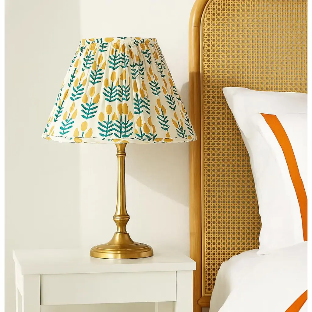 This pleated cotton lampshade adds handcrafted charm and warmth to any interior. Decorated with a hand-block printed floral pattern in rich, warm tones, it blends texture, color, and artistry to complement both modern and traditional décor. The lightweight cotton fabric gently diffuses light, creating a soft, inviting glow that feels cozy and refined. Sized at 7" top, 14" base, and 10" height, it fits most standard lamp bases and enhances everyday lighting with timeless style.