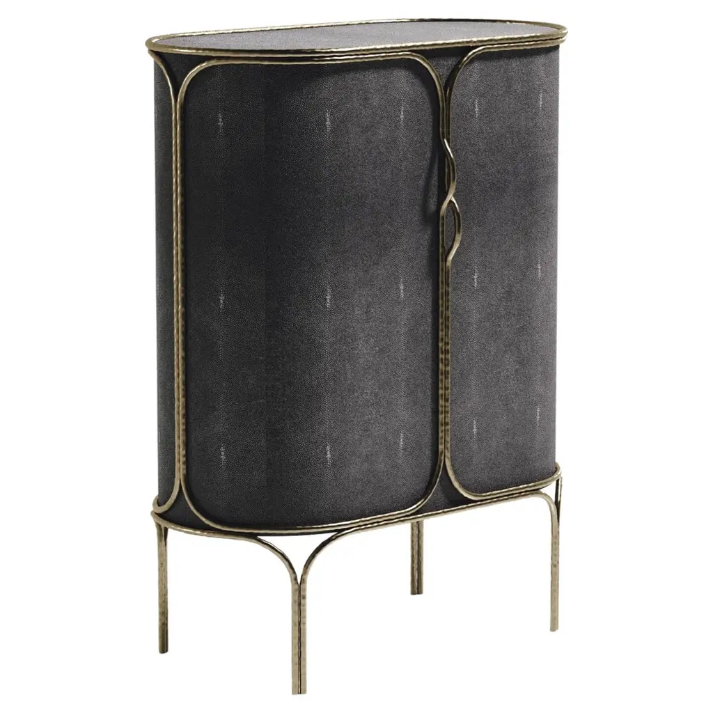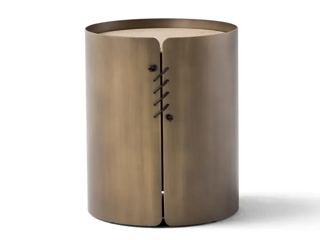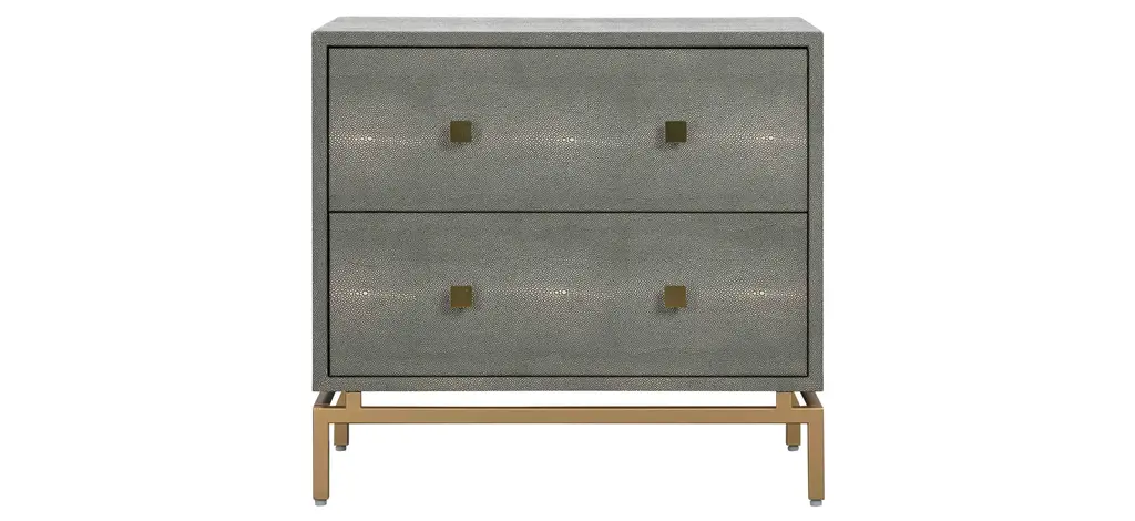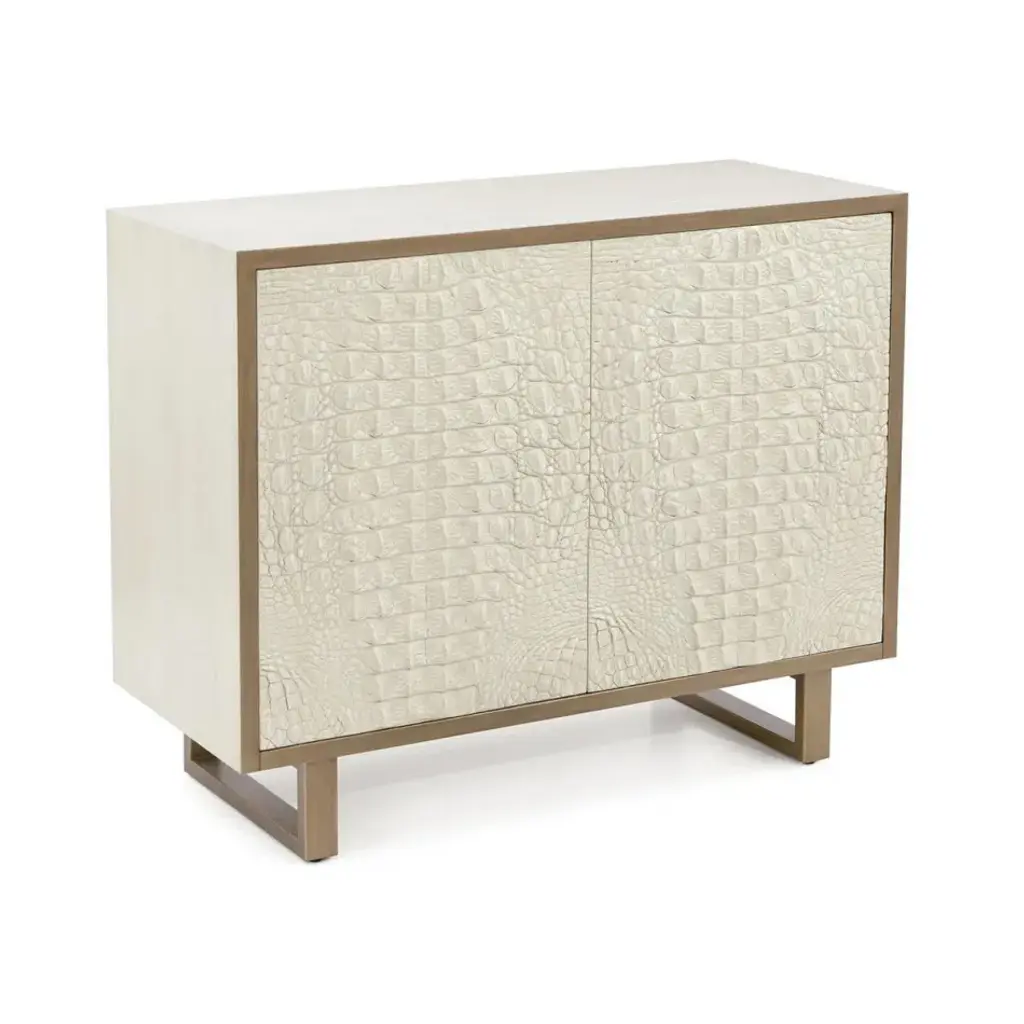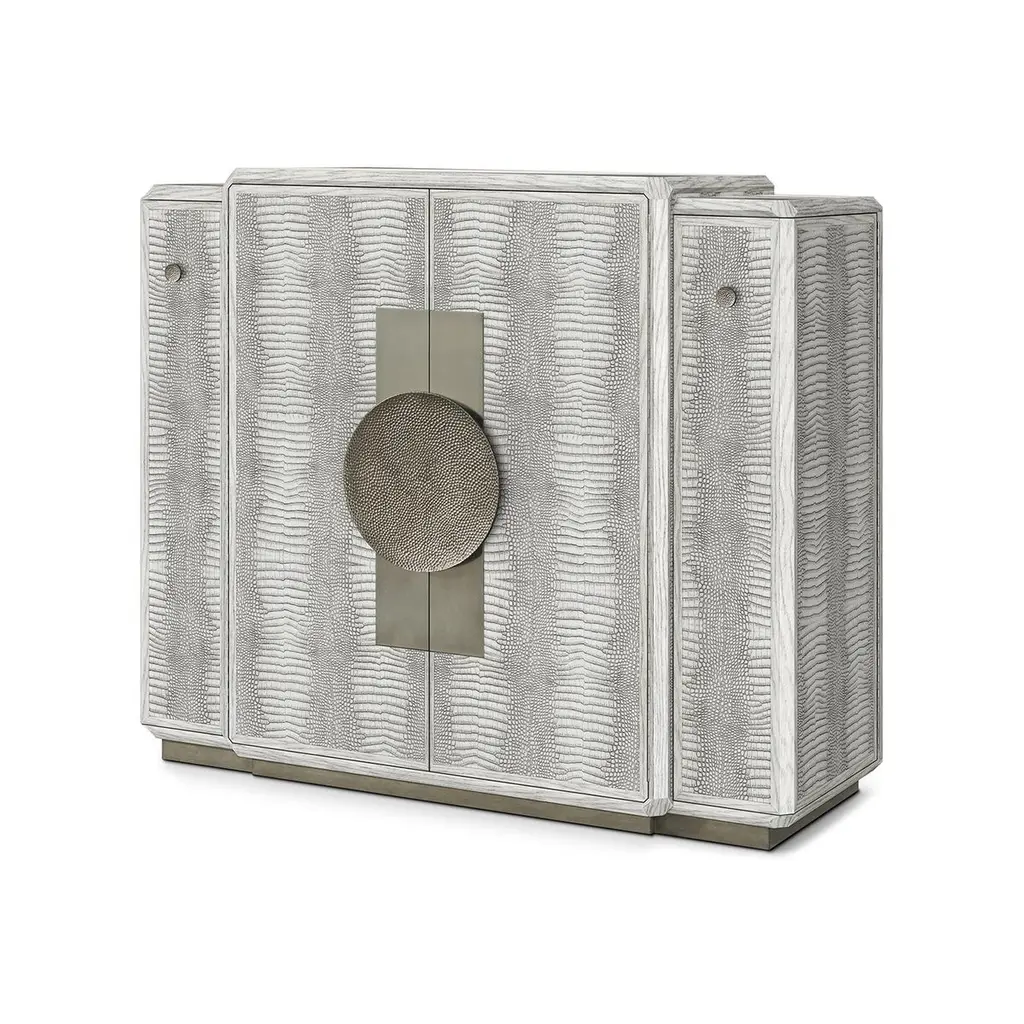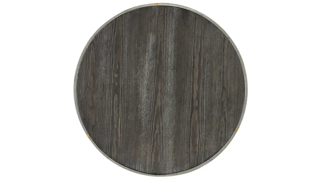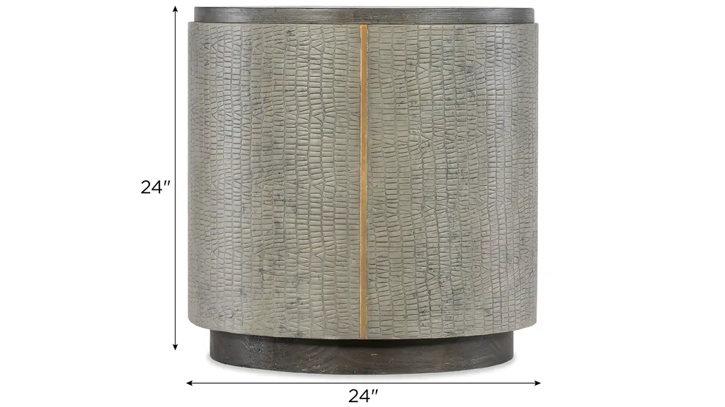 Melange Dylian End Table has a gray crocodile exterior with gold metal accents and a dark wood top and base. Crafted of Pine Veneers and Robus Leather, it is 24 inches round.