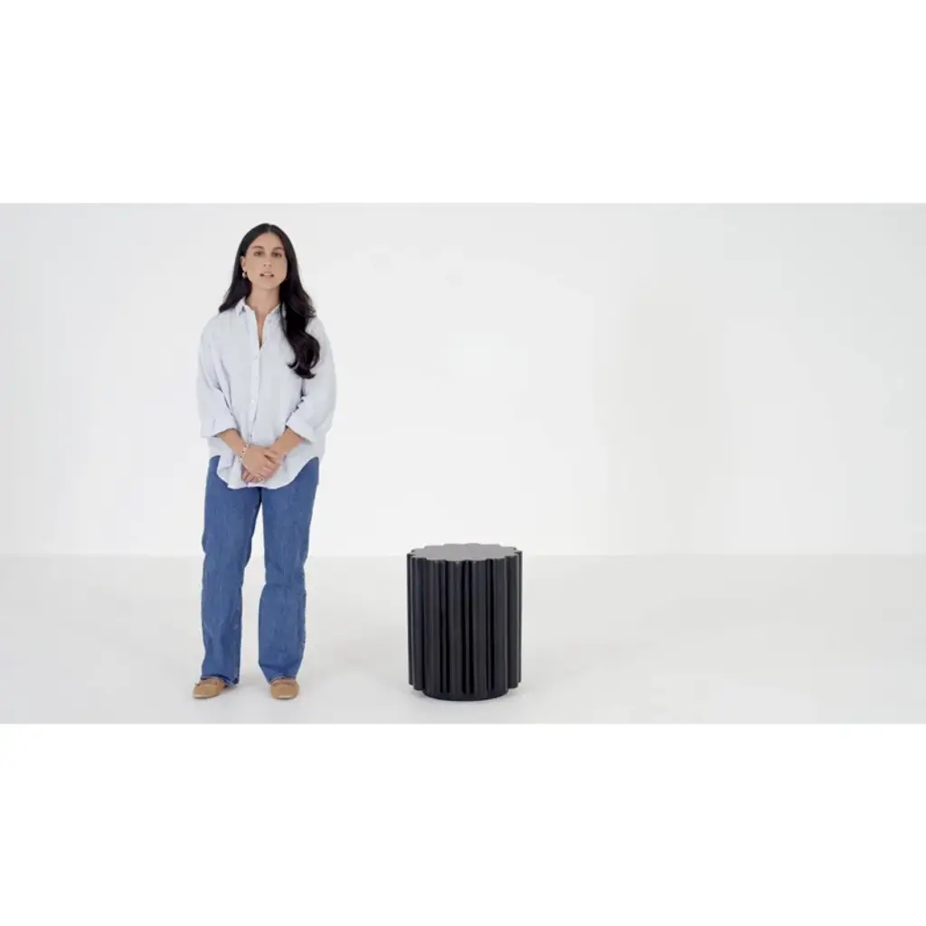 This end table is a sculpted wonder, bringing a trendy twist to any space. Crafted entirely from concrete, it boasts a round tabletop and a cylindrical base with rounded ridges. The rubbed design on the shade adds a touch of rustic charm. Perfect for indoor or outdoor use, this table is as versatile as it is stylish. Use it to hold your favorite books, drinks, or decor pieces. The round shape makes it an ideal centerpiece for any seating arrangement. Plus, its weight capacity of 220 lbs. means it can handle all your essentials with ease.