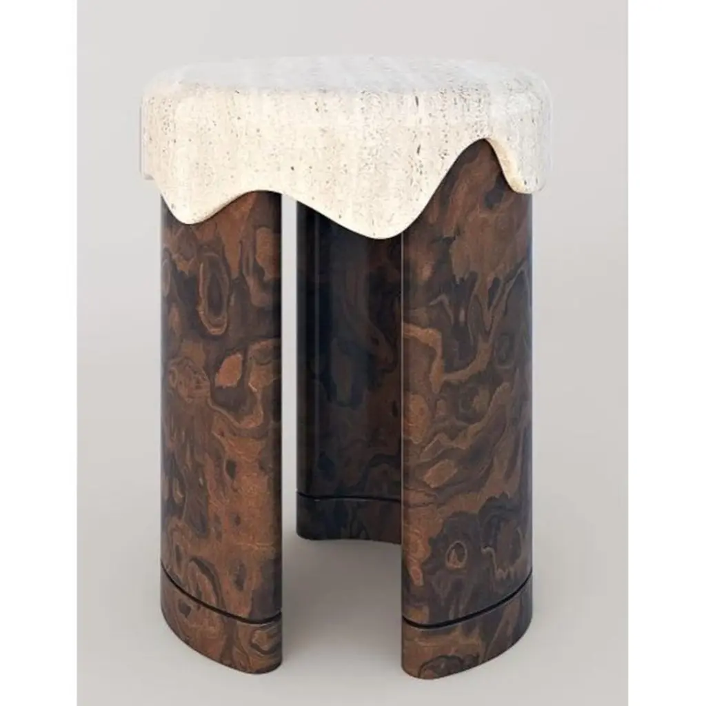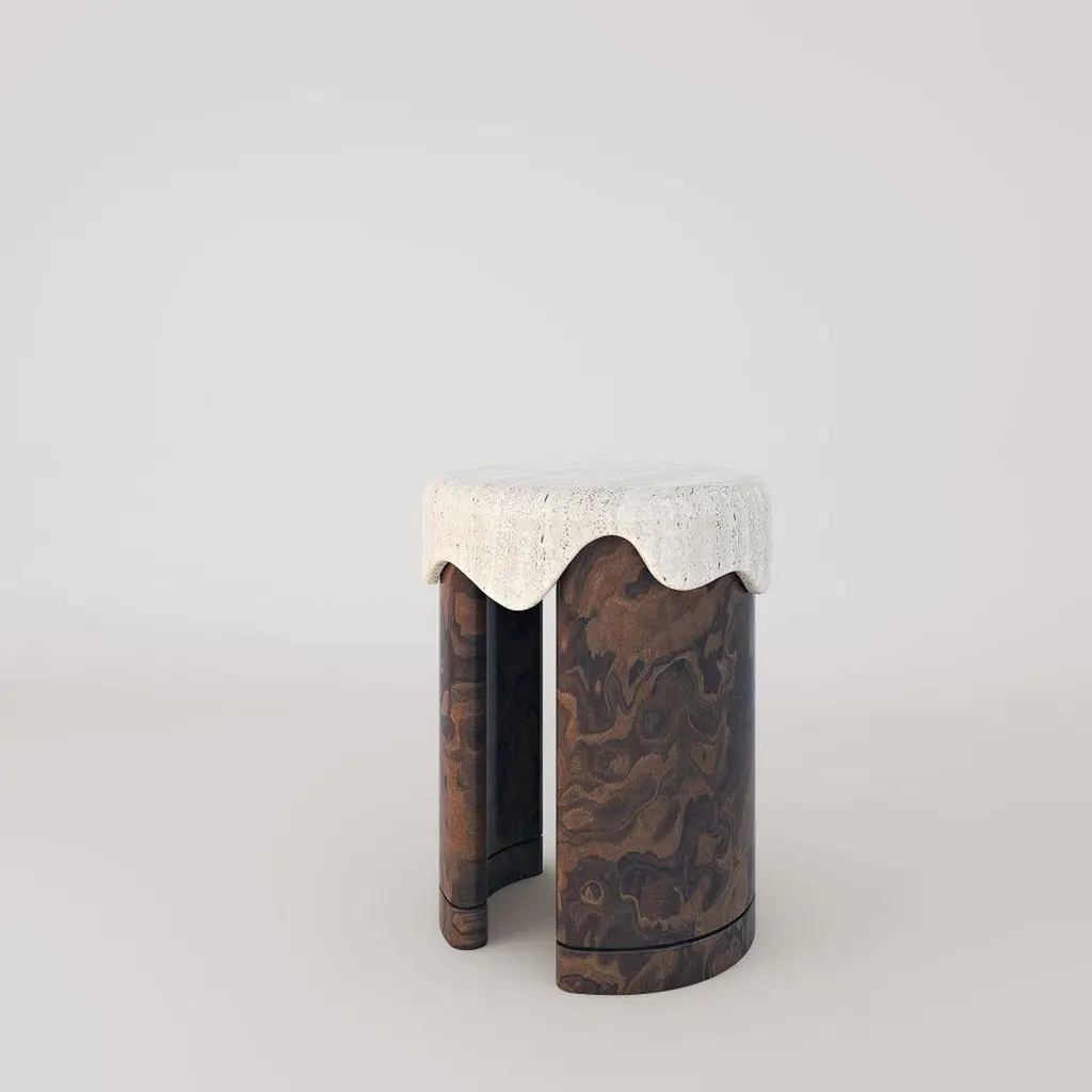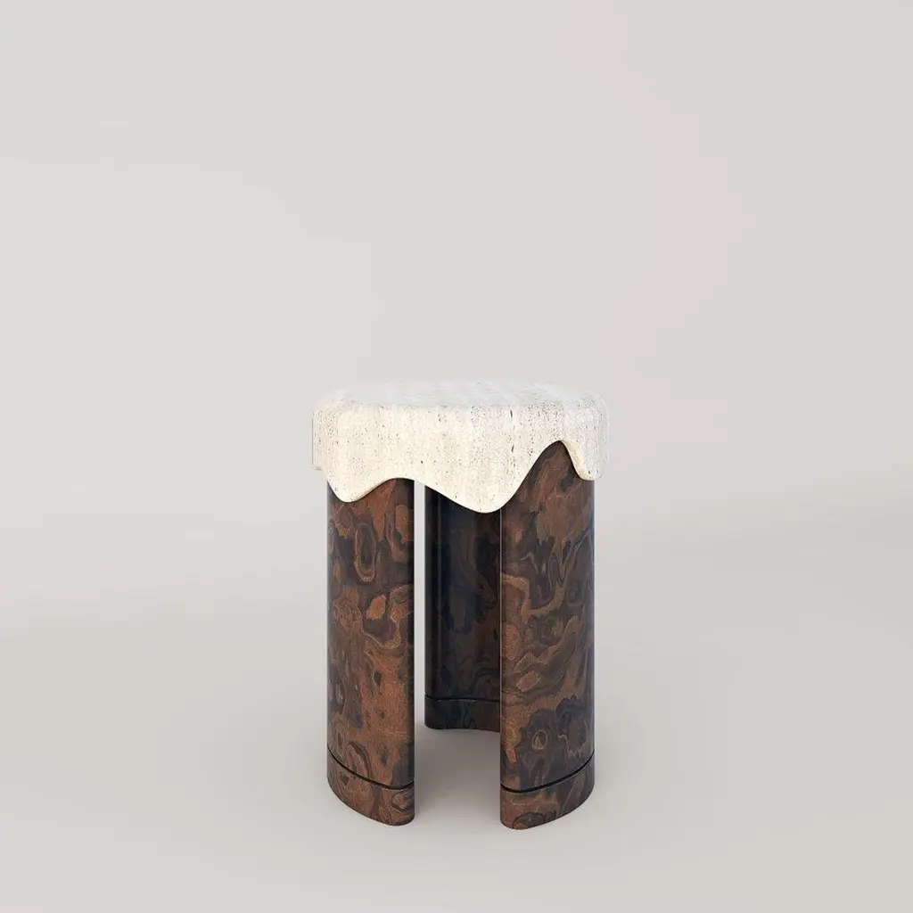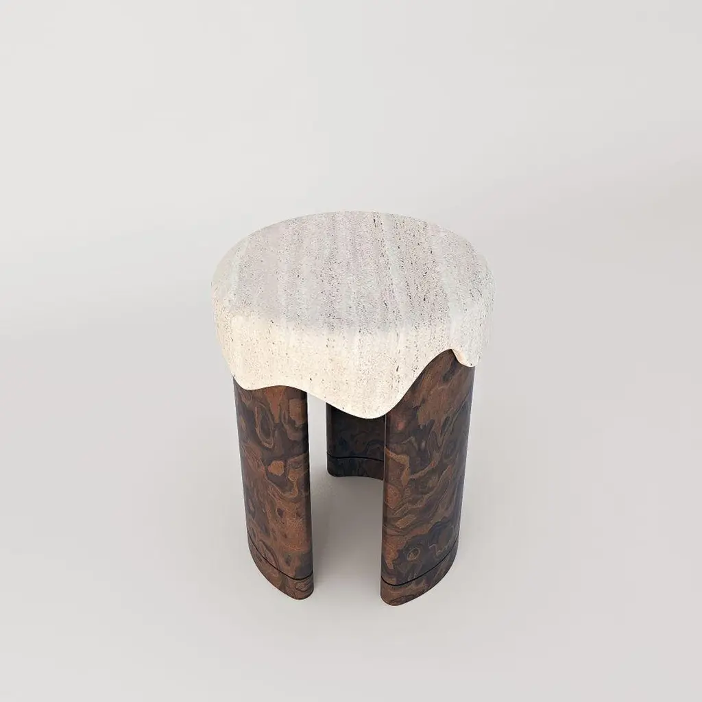 Melt side table - California Burl by Marble balloon.Dimensions: D45cm x H57 cmMaterials: California Burl, Light Travertine, White SugarAlso Available: Walnut Burl, Grey Vavona.Melt Tables and Consoles are registered design products of Marble Balloon. Melt products are formed by carving block natural stones. 3 different wood veneers and 2 different natural stones are offered as alternatives.Marble balloon is an interior design and high-end furniture brand based in Istanbul. Marble balloon is devoted to create refined and sophisticated designs bringing the premium quality materials and finest craftsmanship together. Adhering to a design philosophy cherishing organic and asymmetrical forms whilst challenging the nature of marbles implying fluidity, incorporating only the extraordinary marbles and natural stones into handcrafted and timeless creations.