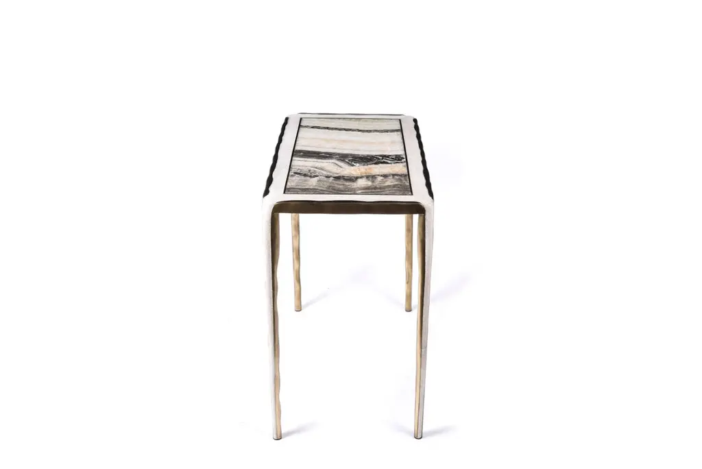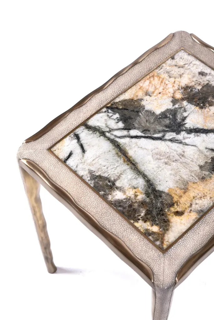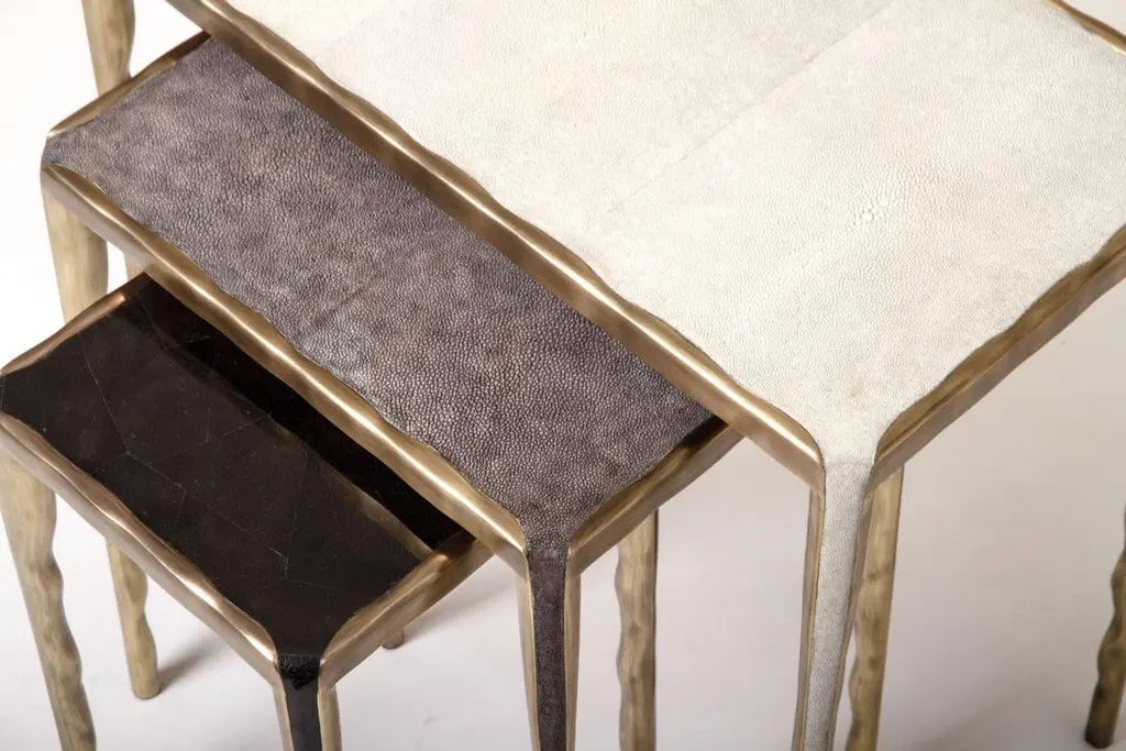 The Paris based label has distinguished themselves since their launch, with their iconic use of shagreen mixed with brass and other exotic materials. All furniture is handcrafted by skilled artisans, ultimately making each piece unique, designed in Paris and produced in the Philippines.The melting nesting side table set of 3, are the perfect accent pieces for any living space. These are sold as a set of 3 to create elegant and geometric shapes, but one can purchase the tables on their own on request. The large and medium size are inlaid in a mixture cream shagreen and onyx, the medium size is completely inlaid in cream shagreen. All the tops are framed with an irregular surface bronze-patina brass that continues onto the legs, which creates the "melting" effect against the shell inlay. These pieces come in other finish variations, see images at end of slide.The dimensions of this piece are:Small 44 x 35 x 50 cm / 17.3 x 13.7 x 19.6"Medium 52 x 34 x 55 cm / 20.4 x 13.3 x 21.6"Large 63 x 35 x 60 cm / 24.75 x 13.75 x 23.75"All R&Y Augousti pieces are handmade by artisans, ultimately making each piece unique. Custom color/sizing available on request. Wipe clean with soft dry cloth.Acclaimed design duo Ria & Yiouri Augousti have established themselves since the 1990s as pioneers of modern-vintage style through their luxurious Art Deco inspired collections.The Paris based label has distinguished themselves since their launch, with their iconic use of shagreen mixed with brass and other exotic materials. All furniture is handcrafted by skilled artisans, ultimately making each piece unique. All shagreen-covered items should be kept out of direct sunlight, color variants may occur on the stingray and other exotic finishes, but this showcases the Parisian label's commitment to creating authentic luxurious products using natural components.