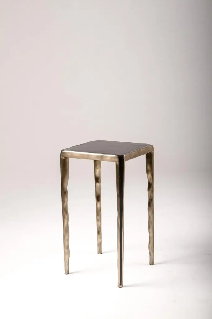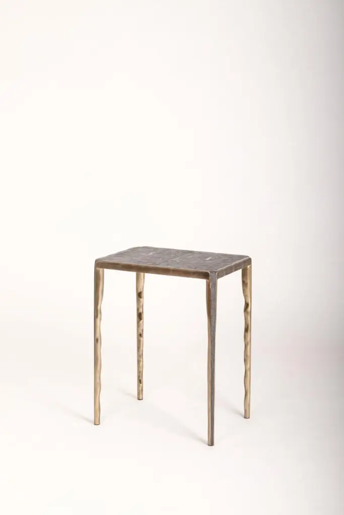 The Paris based label has distinguished themselves since their launch, with their iconic use of shagreen mixed with brass and other exotic materials. All furniture is handcrafted by skilled artisans, ultimately making each piece unique, designed in Paris and produced in the Philippines.The melting nesting side table set of 3, are the perfect accent pieces for any living space. These are sold as a set of 3 to create elegant and geometric shapes, but one can purchase the tables on their own. The large and medium size are inlaid in cream and grey shagreen respectively, the small size inlaid in black shell, and the tops are framed with an irregular surface bronze-patina brass that continues onto the legs, which creates the "melting" effect against the shell inlay. These pieces come in mother of pearl, see image at end of slide. The dimensions of this piece are Small- 28 x 28 x 50 cm / 11.02 x 11.02 x 19.6"Medium- 43 x 31 x 55 cm / 16.92 x 12.2 x 21.6"Large- 63 x 35 x 60 cm / 24.75 x 13.75 x 23.75"All R&Y Augousti pieces are handmade by artisans, ultimately making each piece unique. Custom color/sizing available on request. Wipe clean with soft dry cloth.Acclaimed design duo Ria & Yiouri Augousti have established themselves since the 1990s as pioneers of modern-vintage style through their luxurious Art Deco inspired collections.The Paris based label has distinguished themselves since their launch, with their iconic use of shagreen mixed with brass and other exotic materials. All furniture is handcrafted by skilled artisans, ultimately making each piece unique. All shagreen-covered items should be kept out of direct sunlight, color variants may occur on the stingray and other exotic finishes, but this showcases the Parisian label's commitment to creating authentic luxurious products using natural components.